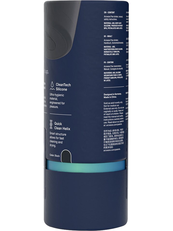 Keeping Pow fresh and hygienic is easy. Arcwave's breakthrough CleanTech-silicone is super-smooth, hygienic and durable but is also highly flexible to fit most penis sizes. Pow has a flexible diameter of 3.0 - 4.5 cm but a penetrating length of 17 cm.