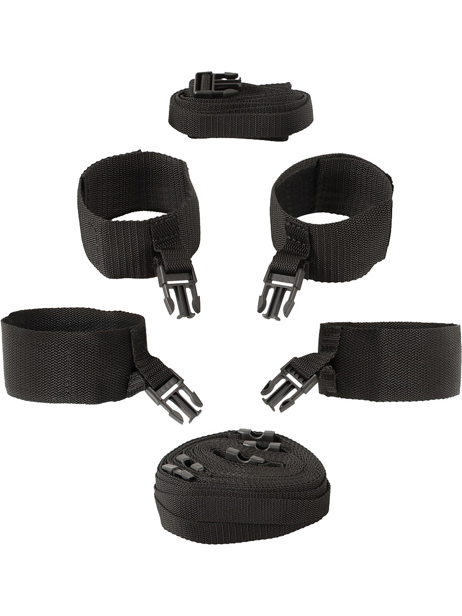 This restraint kit turns any bed or door into an exciting playground bondage for bondage, whether you're at home or on the go. The set contains 2 long straps, a waist-strap and 4 shackles (hand & foot).
