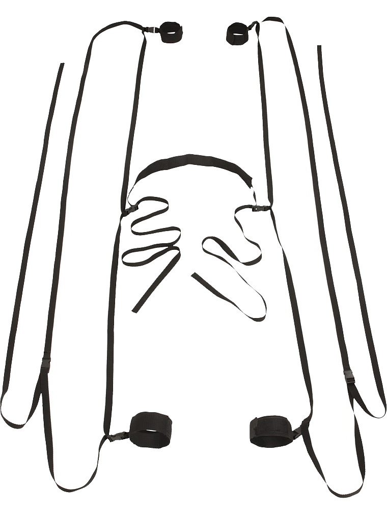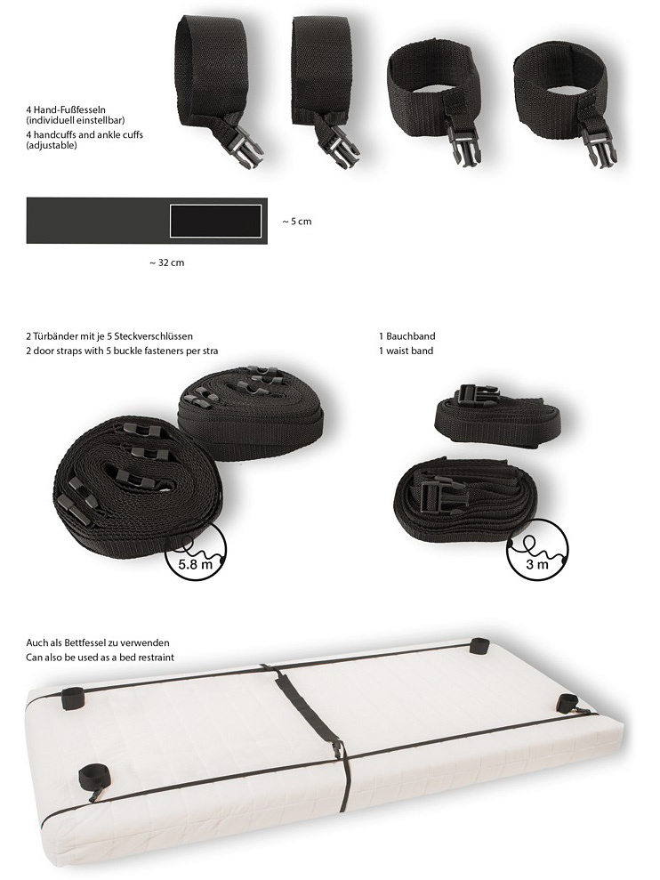 The adjustable and durable straps basically fit around any mattress or door. The adjustable waist strap, handcuffs and footcuffs can be attached to the six clips on the two straps. The shackles are adjustable with practical velcro-straps to fit both him and her.