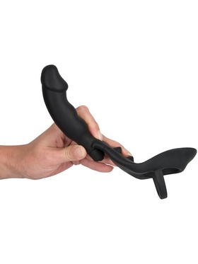 The larger ring wraps around both penis and testicles, while the smaller one adds pressure around the testicles for delayed climax and increased sensitivity. Two fixed bulges stimulate your pelvic floor with every movement, and the realistically shaped anal plug features a lightly textured shaft for deeper stimulation. With a simple press of a button, powerful vibrations are activated to intensify the experience from base to tip.
