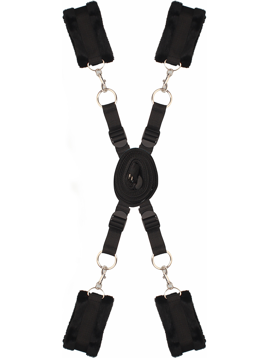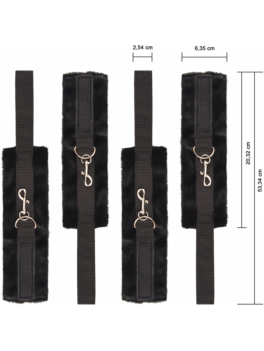 With the help of carabiners and O-rings, you can then fasten the handcuffs and foot-shackles. The soft and fluffy shackles are made of faux fur and can be easily adjusted with the help of Velcro-straps. Limit the mobility of your partner and enjoy the control that is placed in your hands.