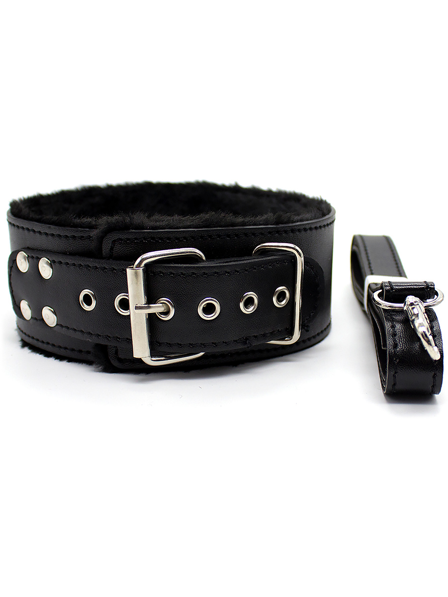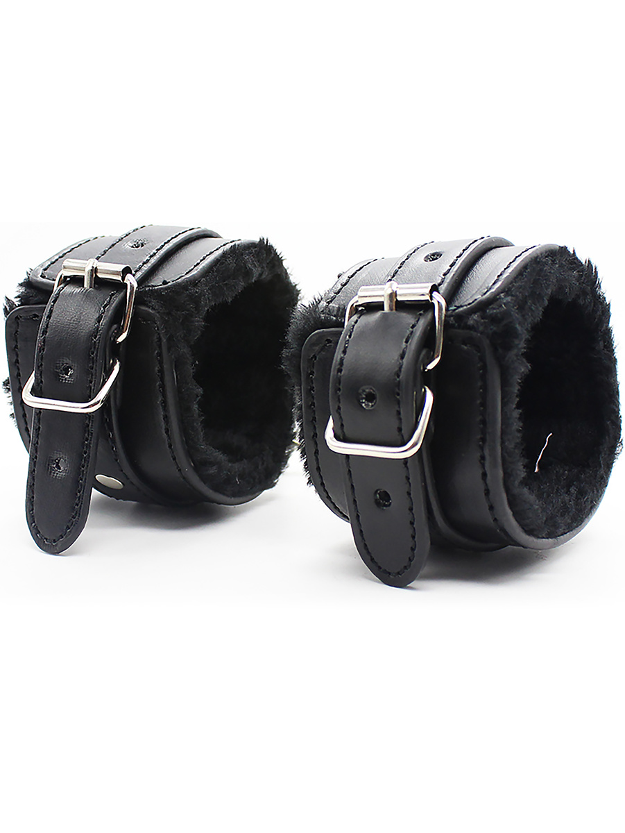 The handcuffs and foot shackles as well as the necklace are lined with a soft faux fur for a luxurious look and comfort. The size can be adjusted using the metal buckles. The leash in artificial leather can be attached to the necklace with the help of a carabiner and D-ring.