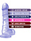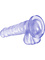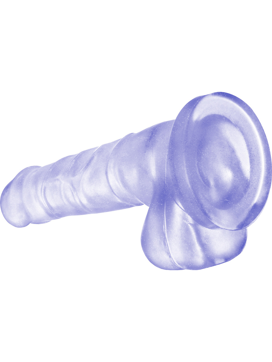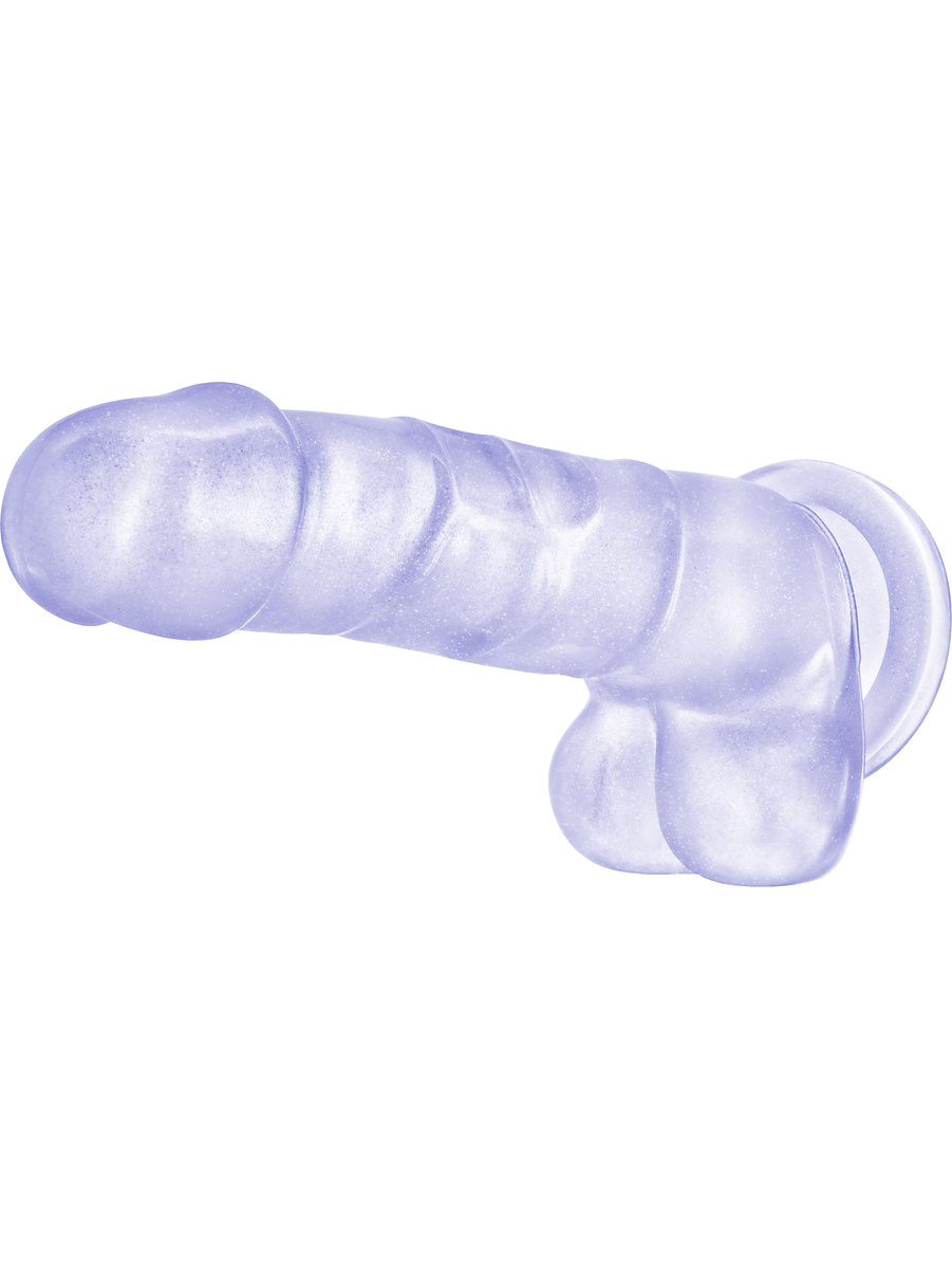 The dildo has a transparent color with shimmering silvery and purple glitter that gives it a playful feeling.