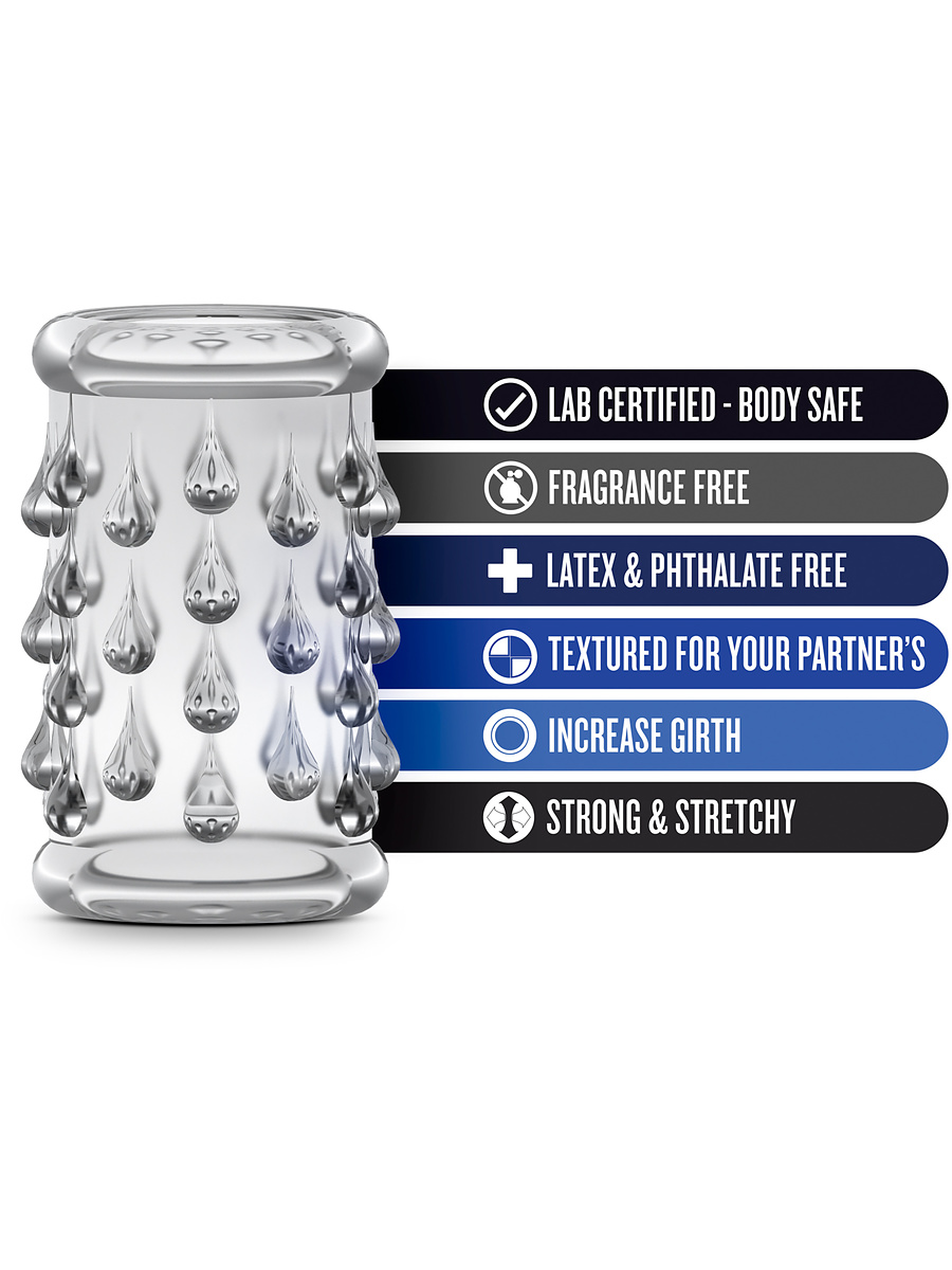 Place the sleeve around your penis to increase girth and intensify sensation. The textured surface with small drops on the outside is designed to stimulate your partner in an intense yet pleasurable way. It is easy to use, stays securely in place, and can also be placed over a dildo if you want to vary your experience.