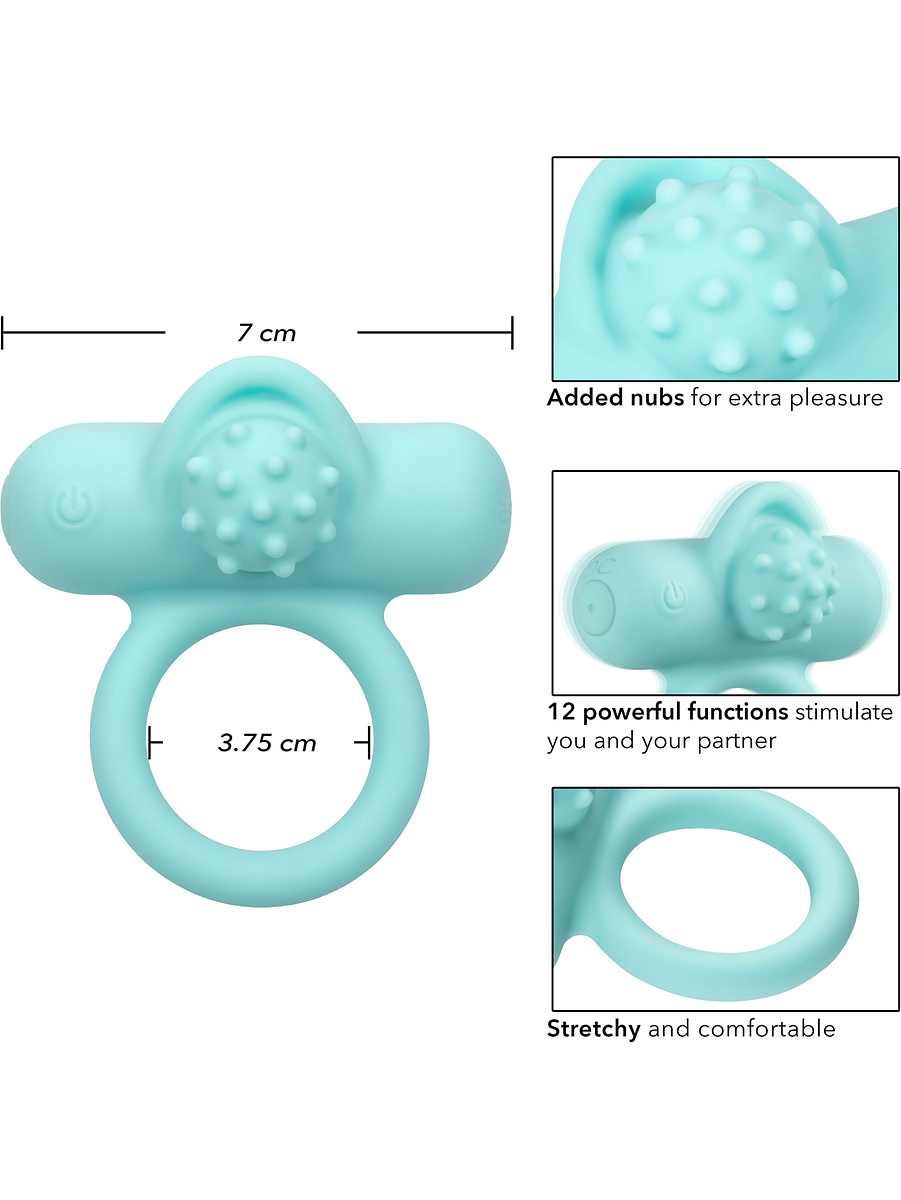 The ring in soft and bodysafe silicone improves endurance, maximizes sensitivity and provides a stronger erection that you can both enjoy. In addition, the vibrations and the ergonomically designed surface with knobs will stimulate your partner's clitoris during penetrative sex.