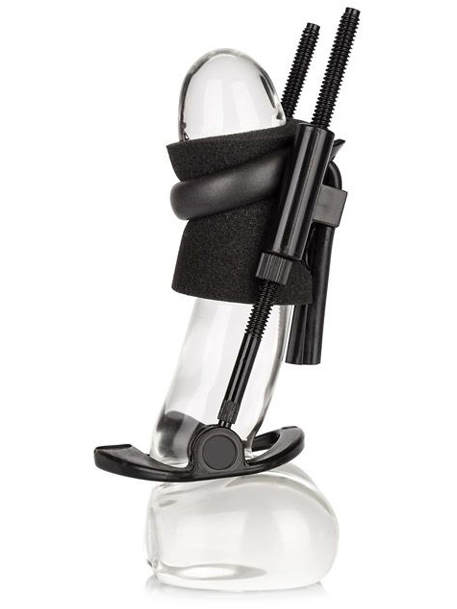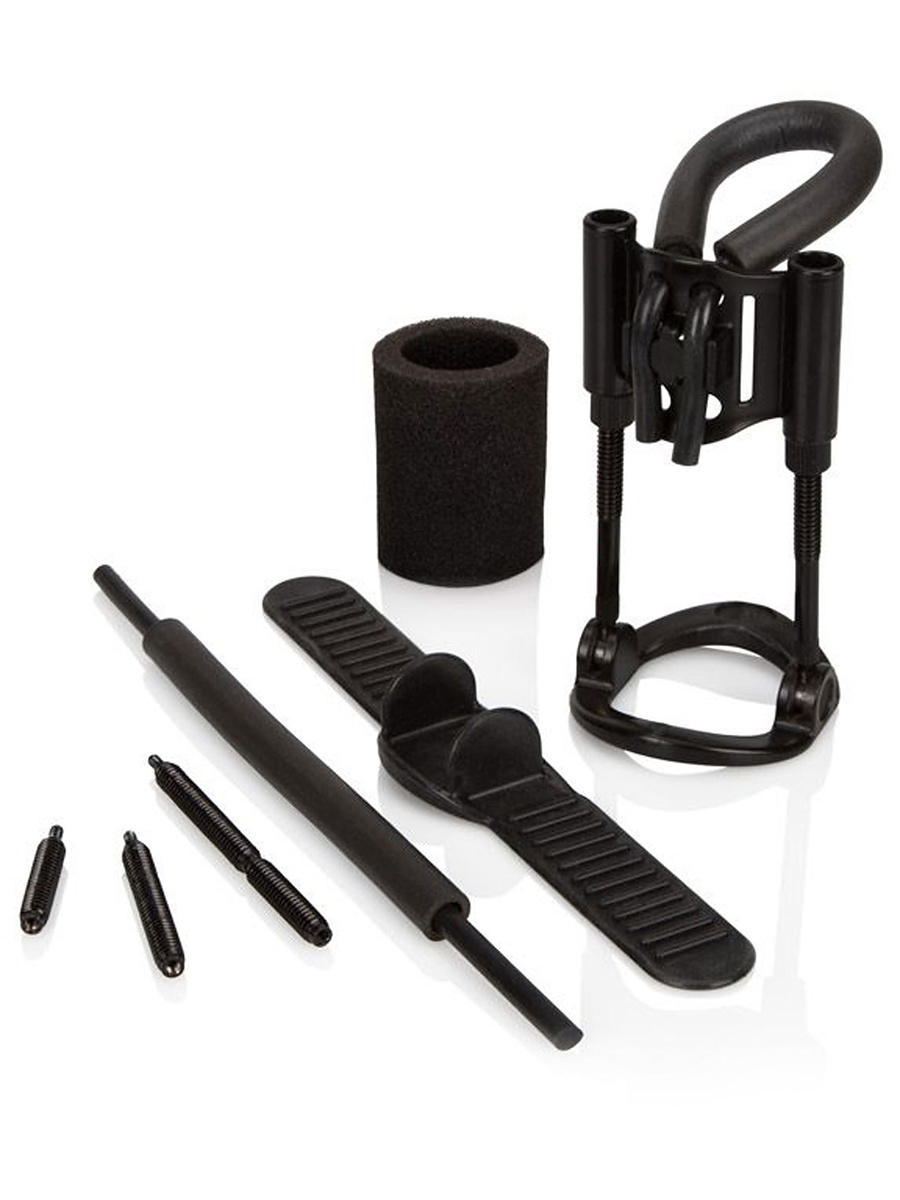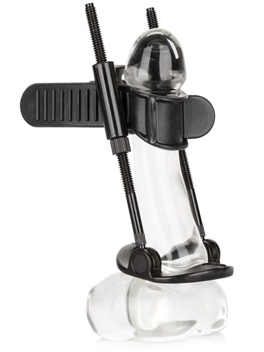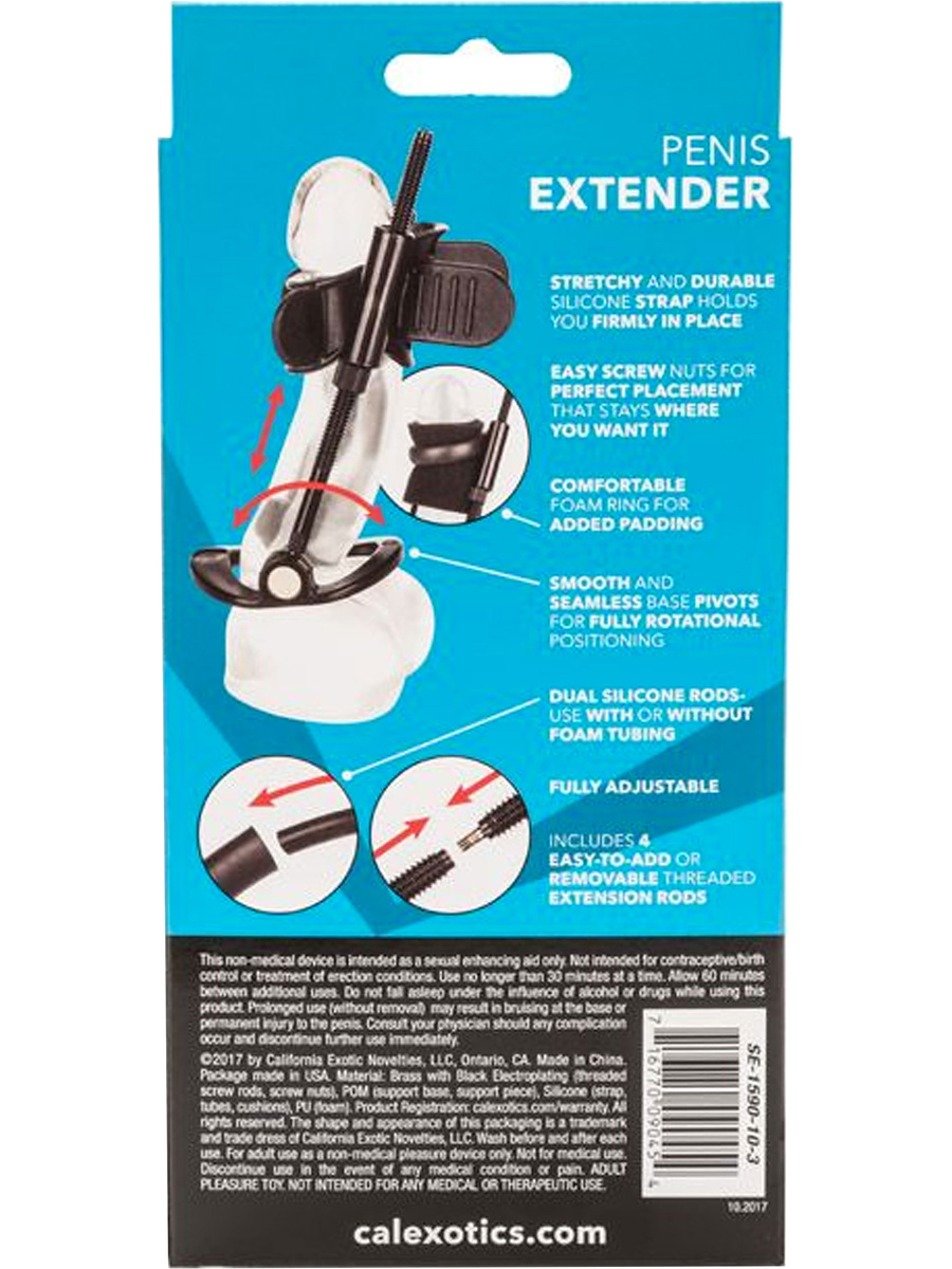 The Penis Extender is placed at the base of the penis and secured with a durable silicone strap that keeps it firmly in place. With the included extension-rods and easy-to-use metal screw mechanism, you can adjust the length to suit your individual needs. For added comfort, padding is included along with two thinner silicone straps that can be used with or without the foam lining.