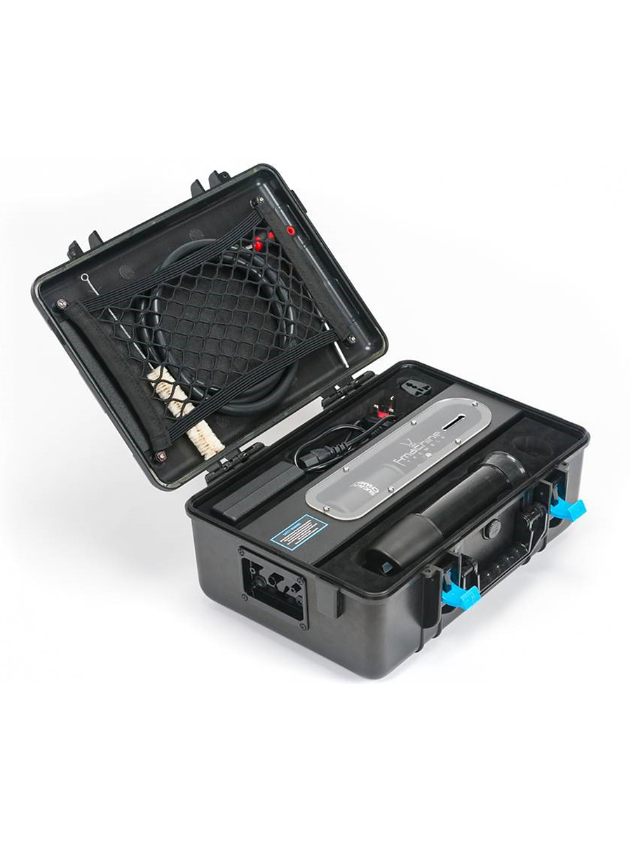 The machine itself is designed as a robust and discreet bag where all the accessories you need are available. With a wireless control, you can easily adjust its speed and suction-power. In addition, all the tools you need for maintenance and adjustment of the machine are included.