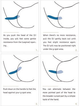 With a curved and asymmetrical shape with clear lines you will easily find your g-spot. When you insert the dildo you will first be met by a light resistance before it slides in smoothly. Then move it back out until you feel the resistance and stay there. Then push the dildo towards your g-spot and change the feel with a simple twist on your hand to find exactly the right point.