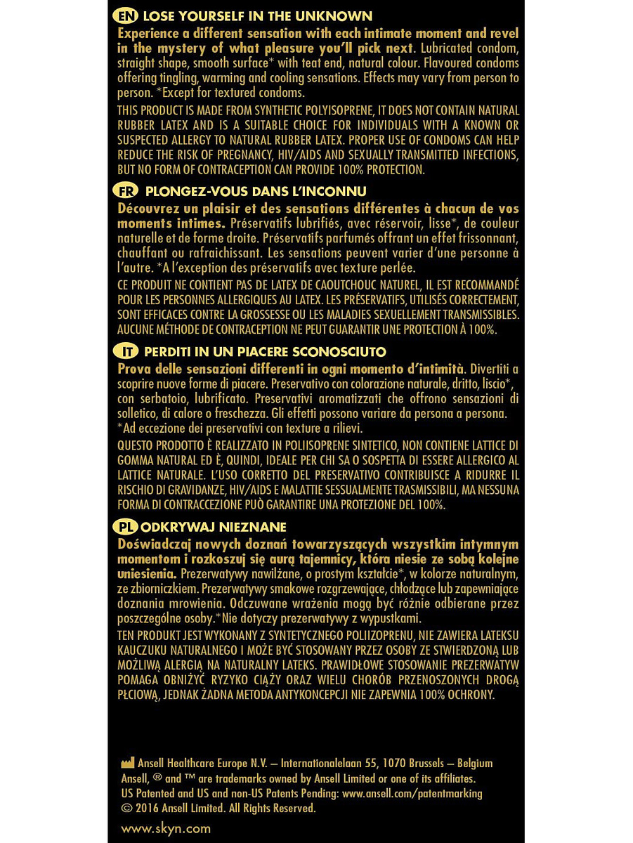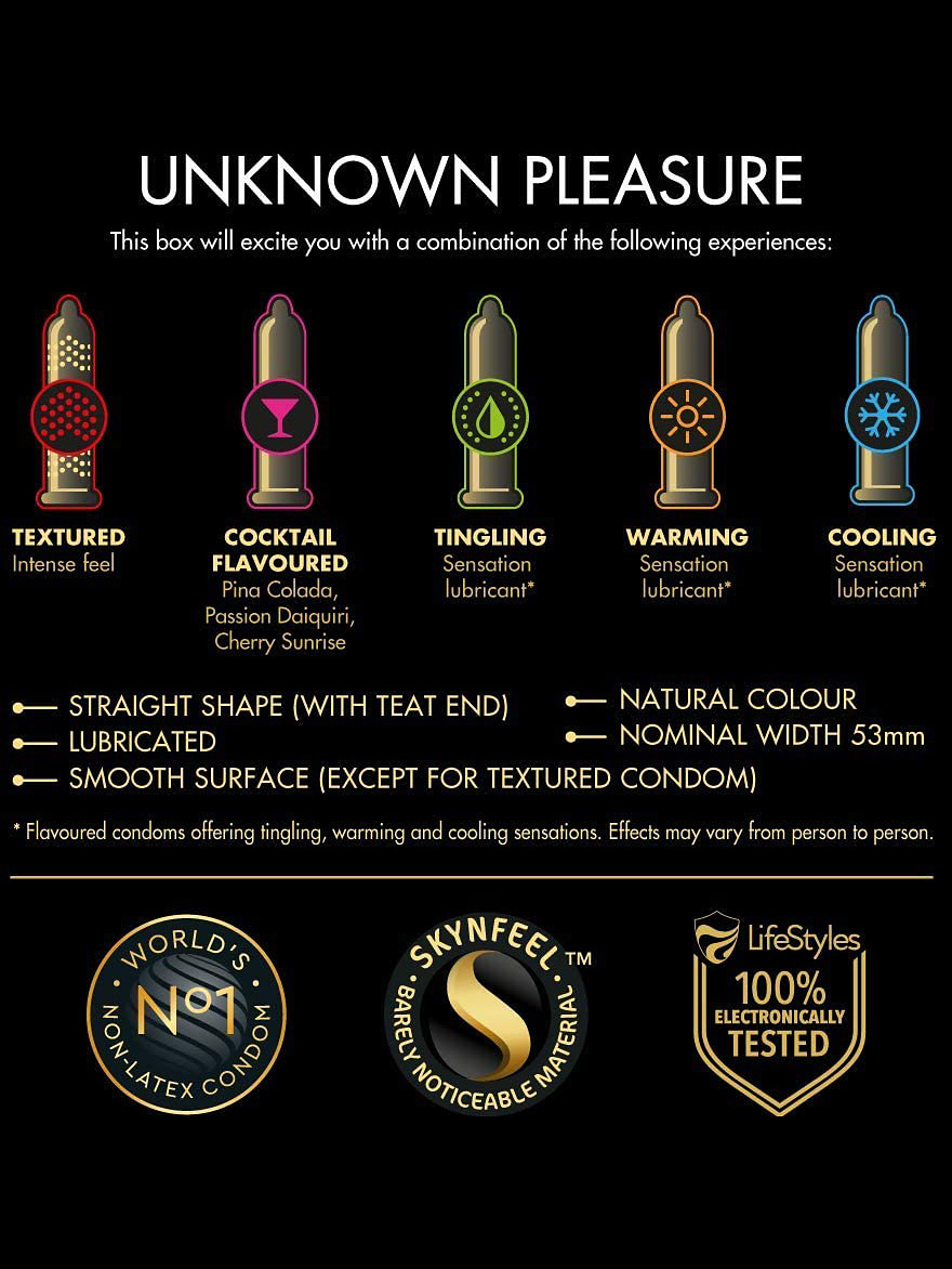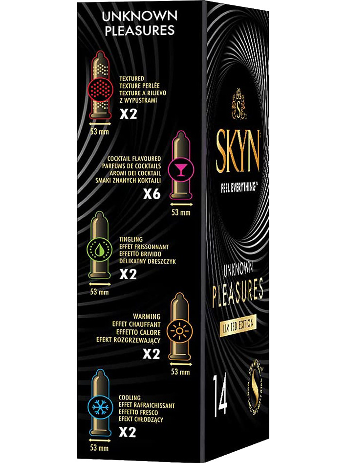 Skyn Unknown Pleasures is a mix pack of condoms for great variety and excitement. All condoms have a straight fit (with container at the top), a transparent color and are treated with lubricant. They all also have a nominal width of 53 mm.