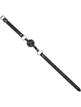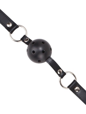 The hard gag ball is made of durable plastic and has a total of 8 ventilation-holes – 4 on each side – which makes it more comfortable to use for longer periods of time because breathing is easier. The ball is attached to 2 durable leather-straps that provide a robust and secure grip.