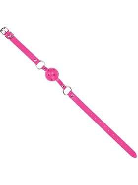 The hard gag ball is made of durable plastic and has a total of 8 ventilation-holes – 4 on each side – which makes it more comfortable to use for longer periods of time because breathing is easier. The ball is attached to 2 durable leather-straps that provide a robust and secure grip.