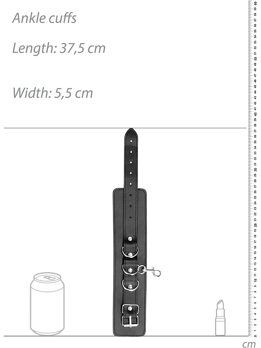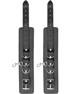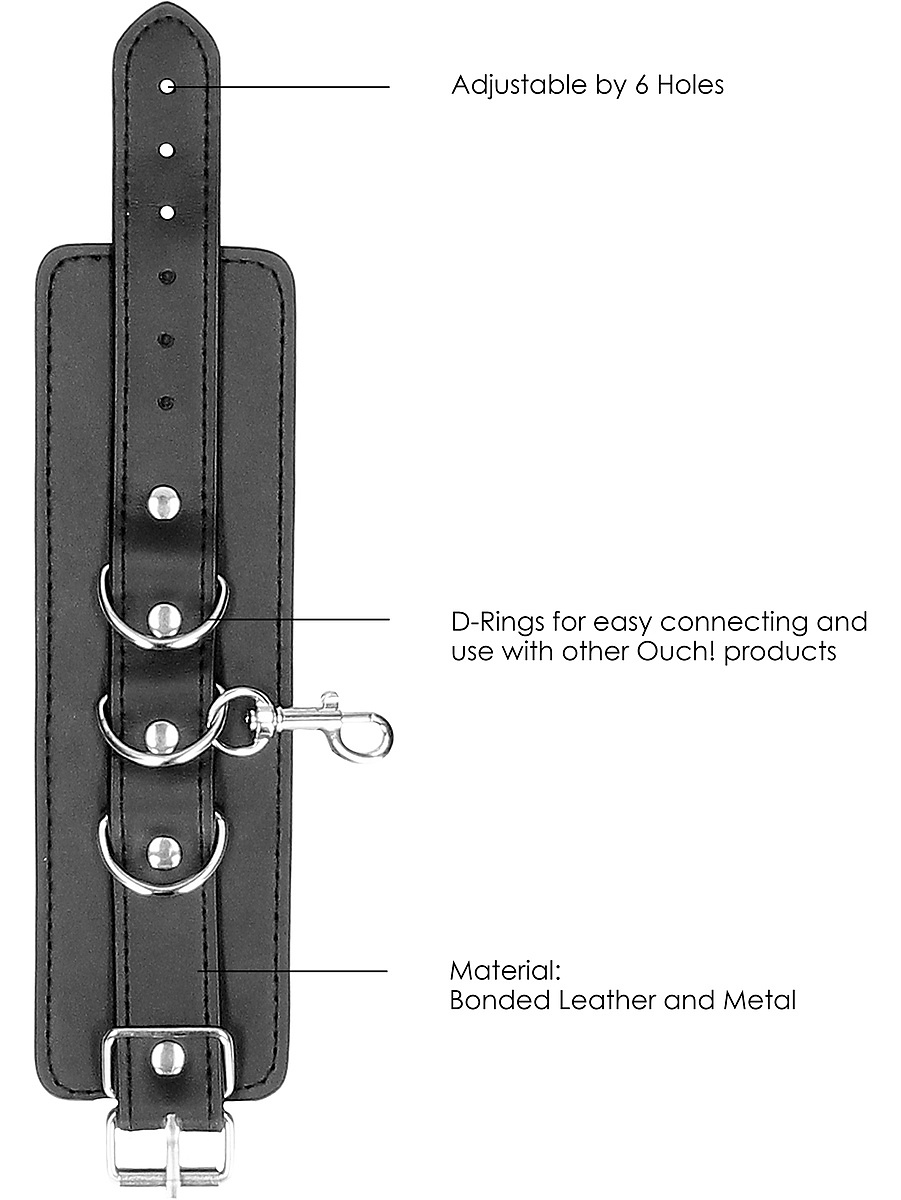The cuffs are made of durable bonded leather – a material that gives a luxurious feel while also being able to withstand tougher grips. The adjustable design ensures a perfect fit regardless of bodyshape, while the inside is soft enough for extended use without discomfort. Thanks to the carabiners, you can also use the hand and foot cuffs separately, or combine them with other accessories in your collection.