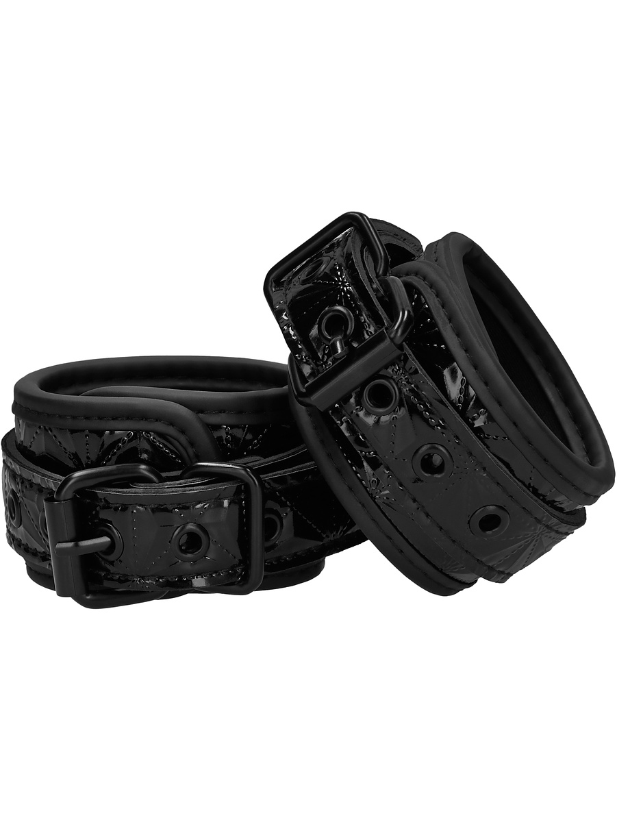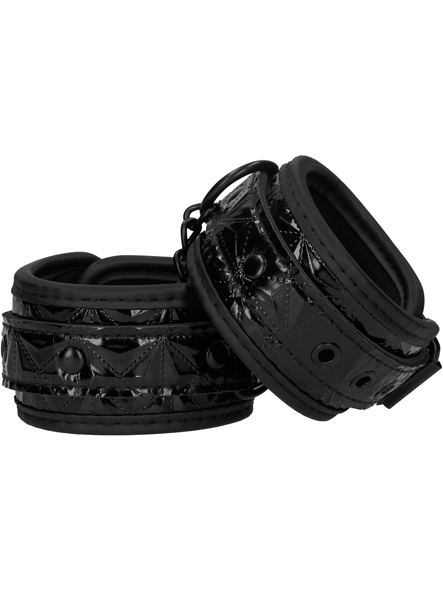 The ankle cuffs are made of comfortable neoprene and vinyl with a trendy diamond pattern. They are adjustable with holes and a buckle for the best fit.