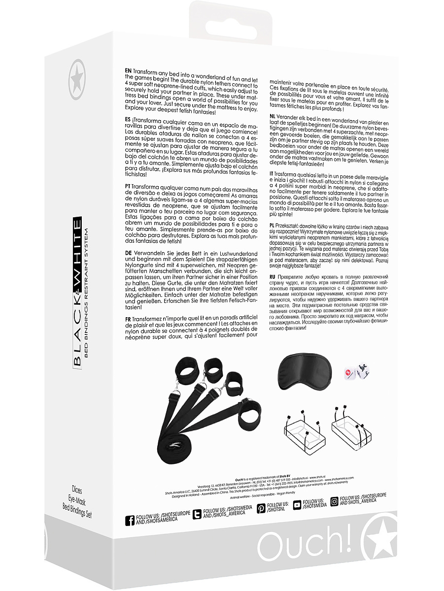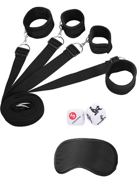 In addition to the nylon straps and cuffs, a blindfold and six dice are also included. With the blindfold, you can eliminate the ability to see to intensify other senses. The sex dice are a playful compliment that determines your sex positions and place.