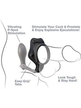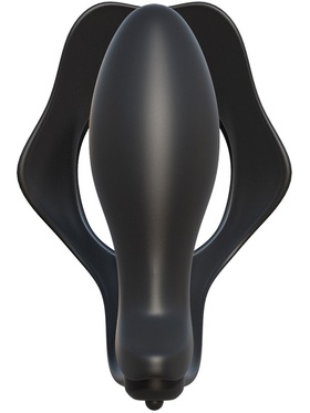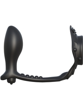 The cock ring wraps around the base of your penis, helping to trap blood and give you a harder, more prominent erection with extended endurance. At the same time, the vibrating anal plug stimulates your prostate, and the textured strap connecting ring and plug massages your perineum for multidirectional pleasure.