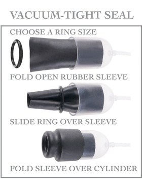 Place the pump over the head of your penis and apply a water-based lubricant for a smoother experience. The suction builds gradually, simulating intense oral sex. Use the hand-pump to adjust the pressure just the way you like it – from gentle stimulation to strong vacuum that makes you twitch with pleasure.