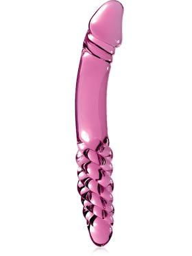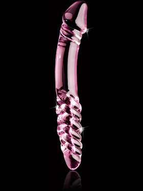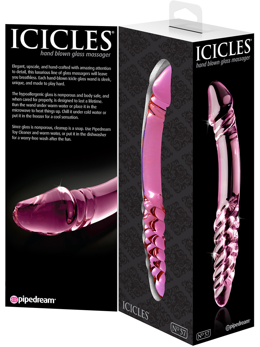 Icicles No.57 is made of durable, transparent glass and features two distinct ends, each with a unique stimulating design. One end has a realistic tip with a ribbed base and a gently curved shaft to massage the G- or P-spot. The other has a spiral, braided texture that delivers intense friction. Both ends are tapered for smooth and comfortable insertion.