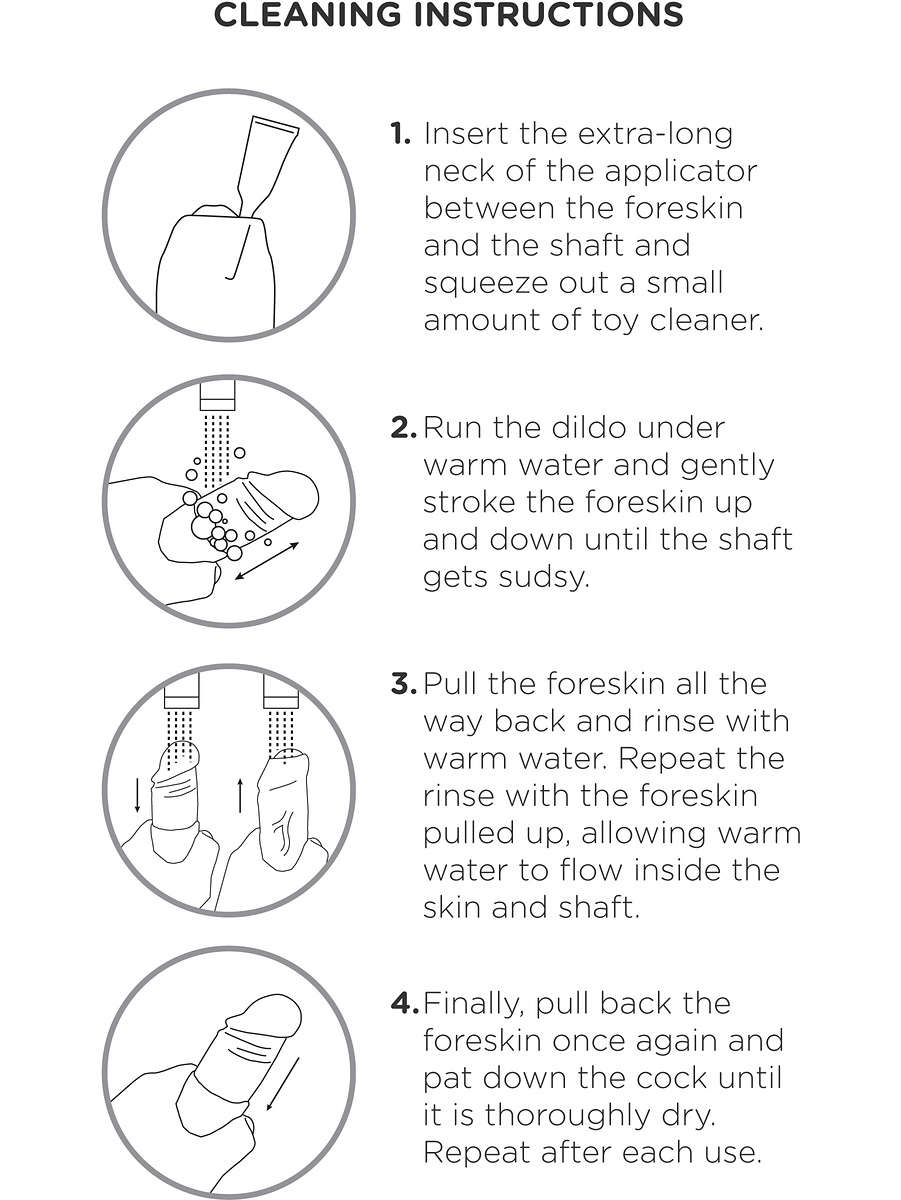To keep your dildo in the best possible condition, it is important to always apply water-based lubricant under the foreskin before pulling it back. It is also important to clean it thoroughly based on the instructions on the package.