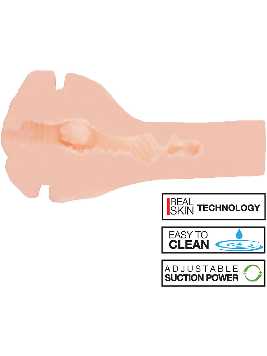 The soft sleeve in qualitative and durable TPR has an opening that is shaped like a realistic vagina and gives a lifelike sensation. On the inside there is a varied texture with stimulating knobs and grooves in different directions. The shell gives you a comfortable grip and at the bottom there is a small hole that allows you to adjust the sucking feeling yourself by placing your finger over the hole.