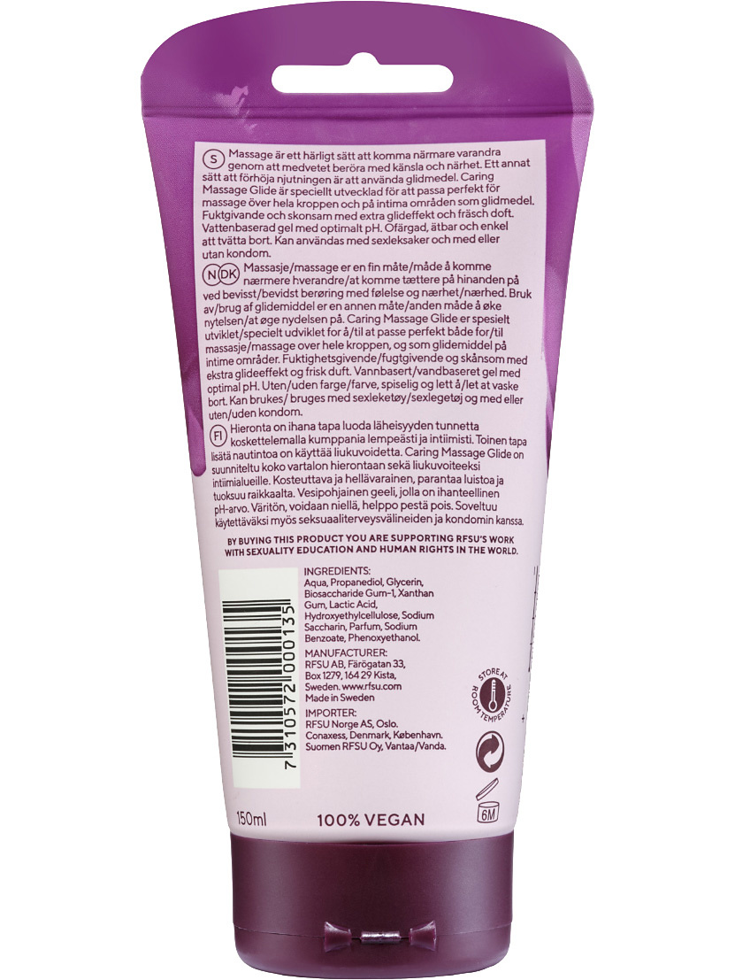 Caring Massage Glide is the ultimate 2-in-1 lubricant for those who want to combine pleasure with caring properties. The silky formula works as both a luxurious massage oil and a high-quality lubricant, allowing you to smoothly go from relaxing massage to more intimate moments without interruption.