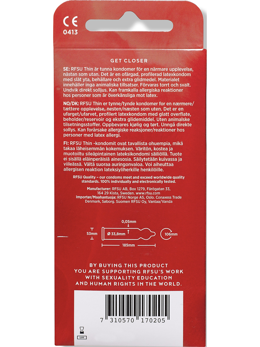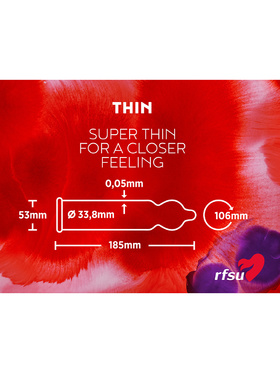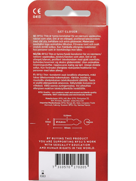 RFSU Thin combines a natural feeling with effective protection against both unwanted pregnancy and sexually transmitted diseases. All condoms undergo strict electronic testing to ensure the highest quality and safety.