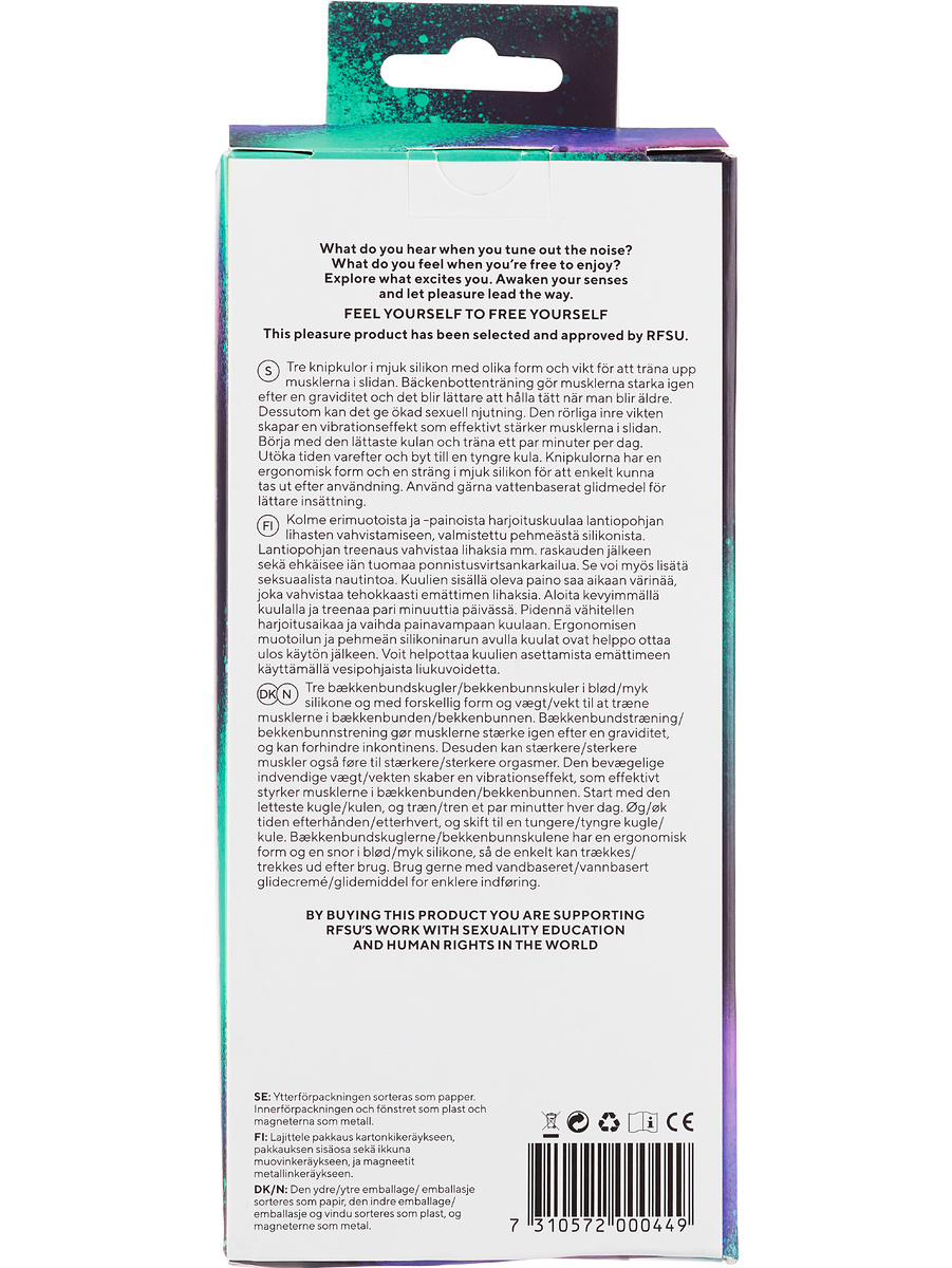 The Vaginal Trainer Set from RFSU is a complete set with three ergonomic balls in different sizes, shapes and weights. Use the pinch balls to effectively train your pelvic floor, for example in case of incontinence or after pregnancy. A strong pelvic floor can also enhance sexual pleasure.