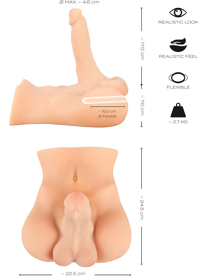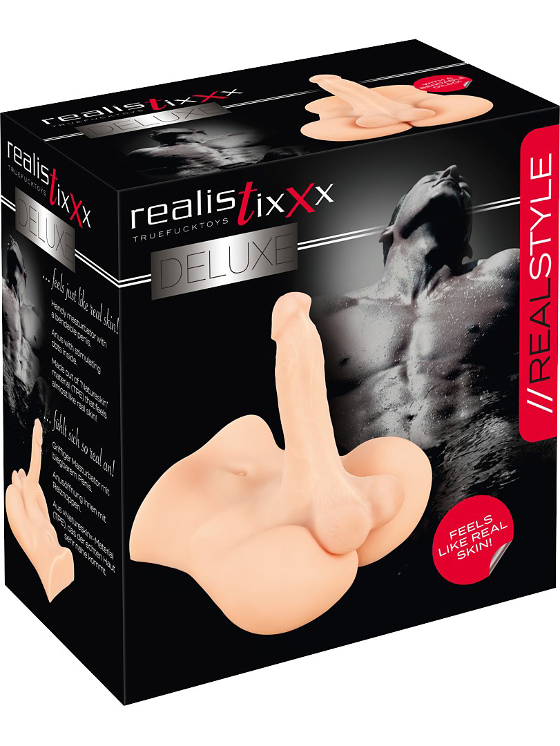 Deluxe Man 02 is a realistic torso masturbator with a flexible penis, firm scrotum and a tight anus hole that you can penetrate. The tight but stretchy pleasure channel has an exciting texture with knot lines and grooves for an intense and realistic anal penetration.