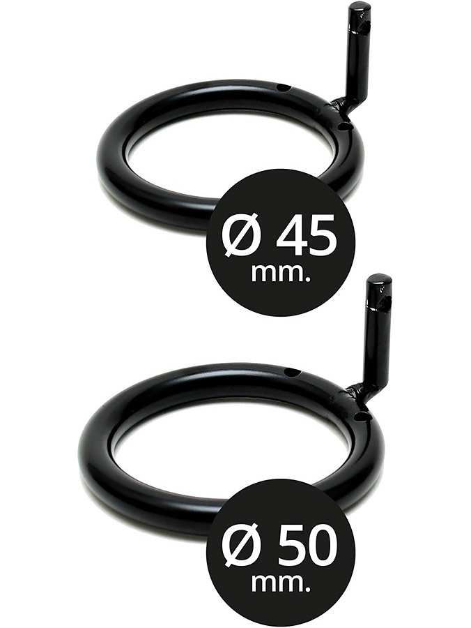 The chastity cage is made of metal with two base rings included (4.5 cm & 5.0 cm). The cage prevents him from getting a full erection, which can be as frustrating as it is exciting. When you later choose to propose to him, he will be more ready than ever!