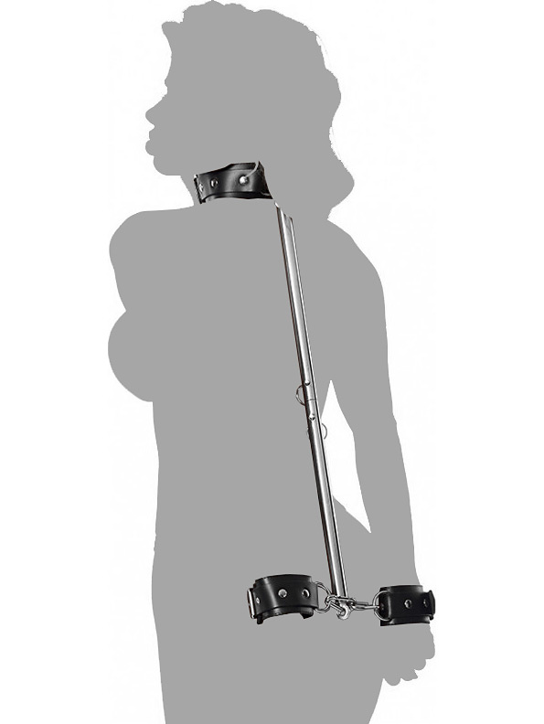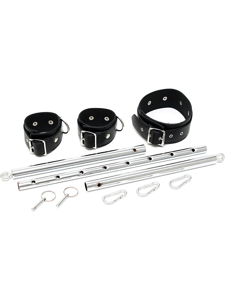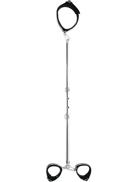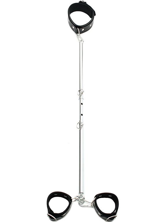 This is an adjustable metal Spreader Bar with two handcuffs on one end and a collar on the other. The handcuffs and collar are made of genuine leather and are easily attached to the pole via carabiners.