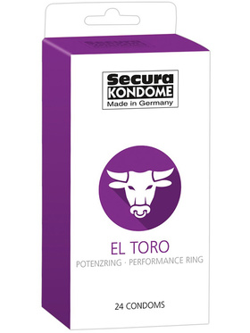 El Toro contains 24 latex-condoms treated with high-quality lubricant for optimal and long lasting glide. They are transparent, cylindrical and with a container on top.