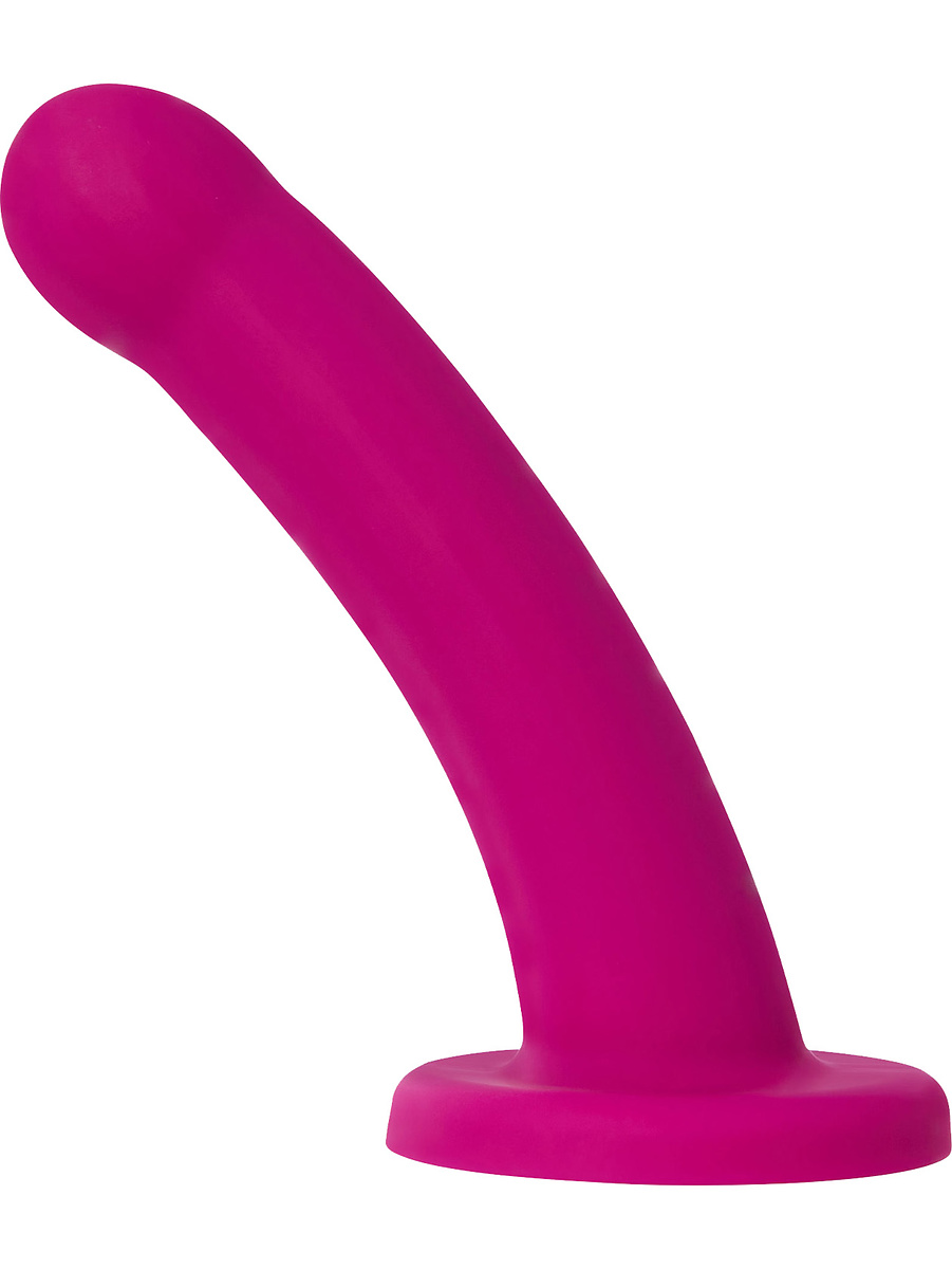 The dildo has a curved shaft with a faintly marked tip that targets the woman's G-spot or the man's prostate. Explore new erotic adventures with its silky shaft, whether you play solo, with a partner or use it as a strap-on. The dildo has a suction cup that not only allows you to enjoy completely hands-free, the suction cup also makes it compatible with most strap-on harnesses.