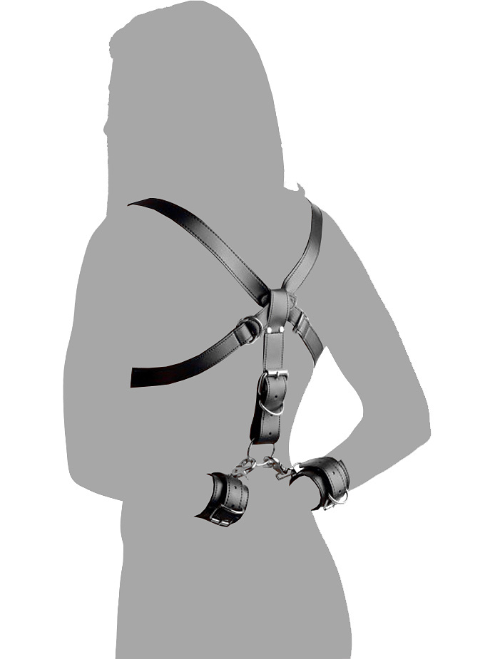 With the help of hooks and metal rings, you can fasten her/his thighs in the strap that goes under the breasts to leave them completely open for whatever you want. Feel free to use the delicious handcuffs to attach your hands behind your back.