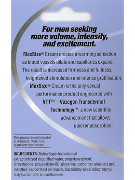 Max Size Cream gives you a harder erection, heightened sensation, and a more relaxed experience in bed. It's versatile, easy to use, and ideal for those wanting to reduce stress and enhance pleasure.