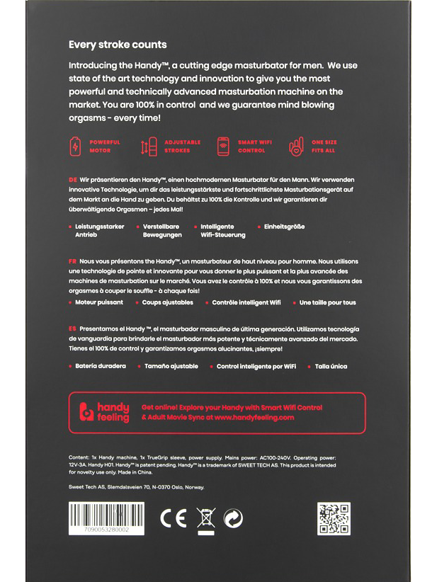 Handy can be connected to the internet via an encrypted WiFi thanks to its integrated Dual Core-processor. Stroking length and speed can be controlled remotely from anywhere in the world via the website handyfeeling.com on your computer, mobile or tablet. Here you will also find videos that the product can be synchronized with for virtual and exciting experiences. Handy can also be connected to VR-headsets.
