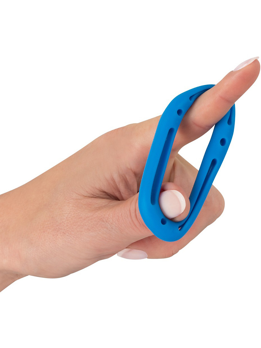 This set contains two cockrings, where color (light blue/dark blue/grey/black) and design (smooth/with holes) are selected at random. However, all cockrings are the same size with an inner diameter of 3.8 cm (flexible).