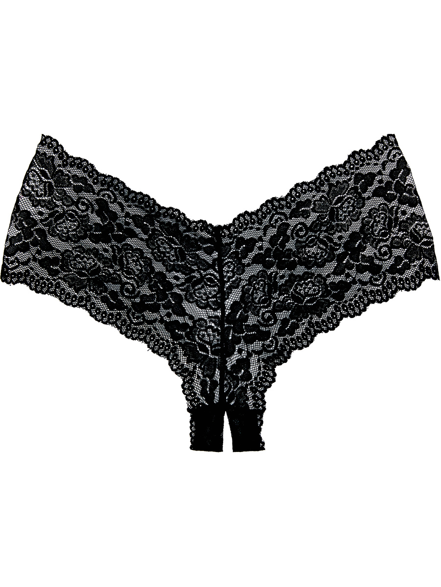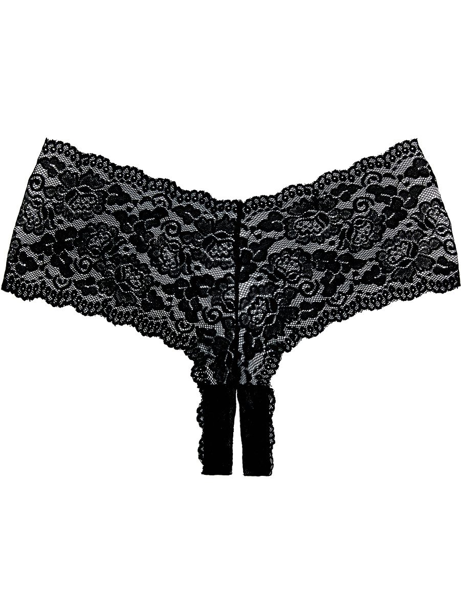 Delicious black and classic lace-panties with a little twist. The panties have a crotchless design that leaves your most intimate parts bare for more intimate games with your partner. The lace-panties rest beautifully over the hips and sit sexy over the bum.