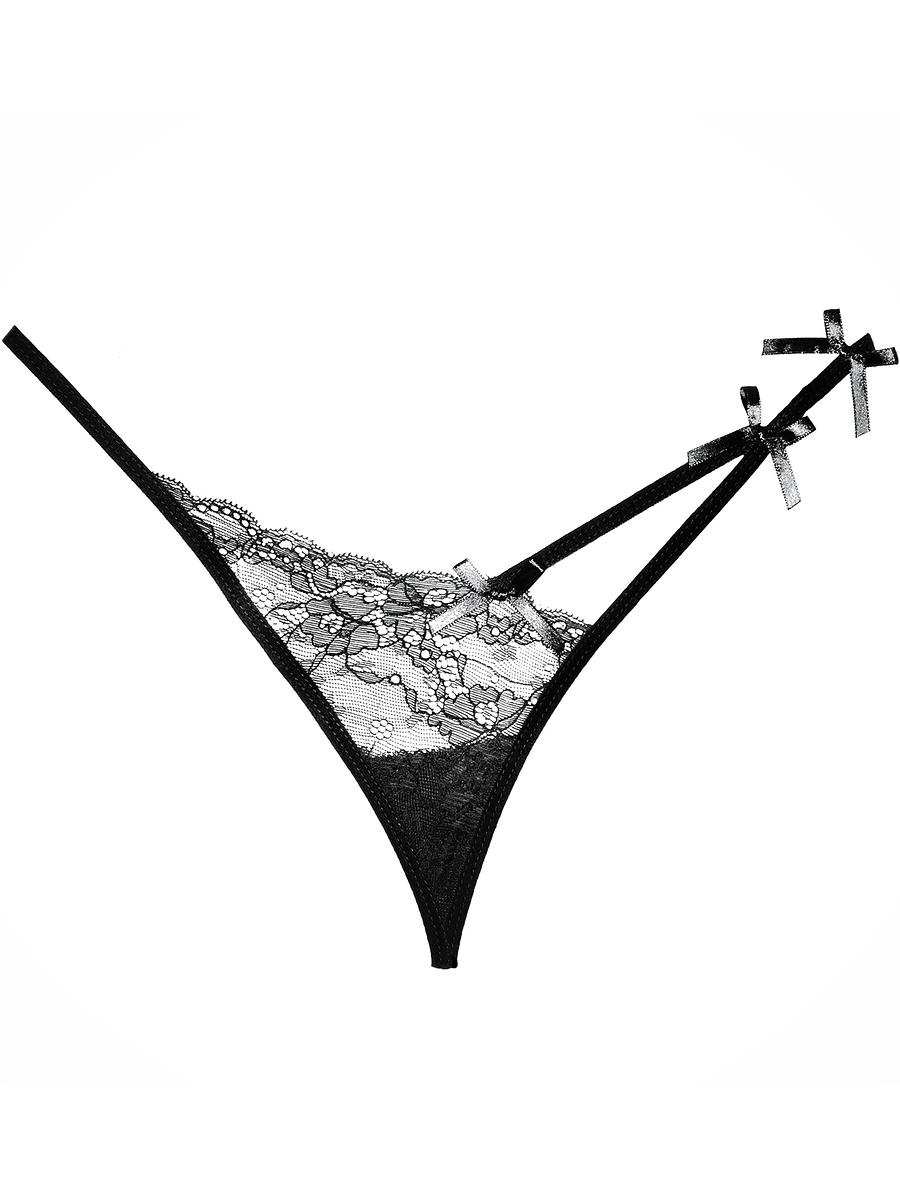 Delicate thong with beautiful lace-details and three bows at the front. At the back, there is a small lace and a small bow that completes the seductive design.