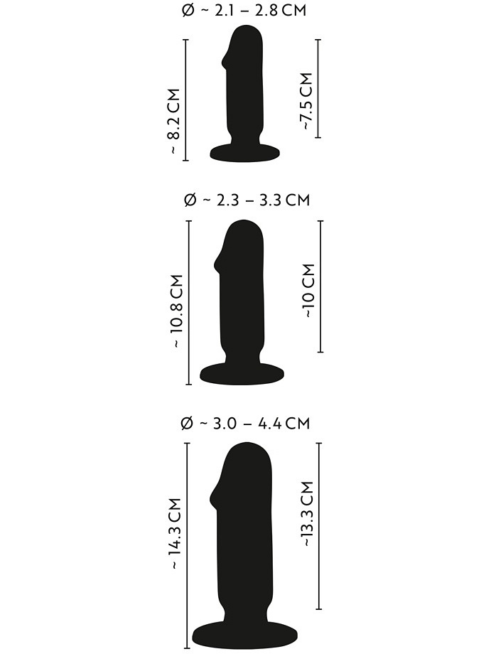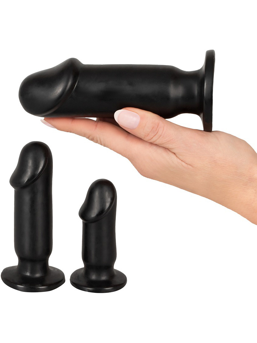 Each butt plug has a realistically shaped glans and a large suction cup that allows it to be worn securely (for long periods) without slipping in too far. The plugs are also perfect for handsfree pleasure.