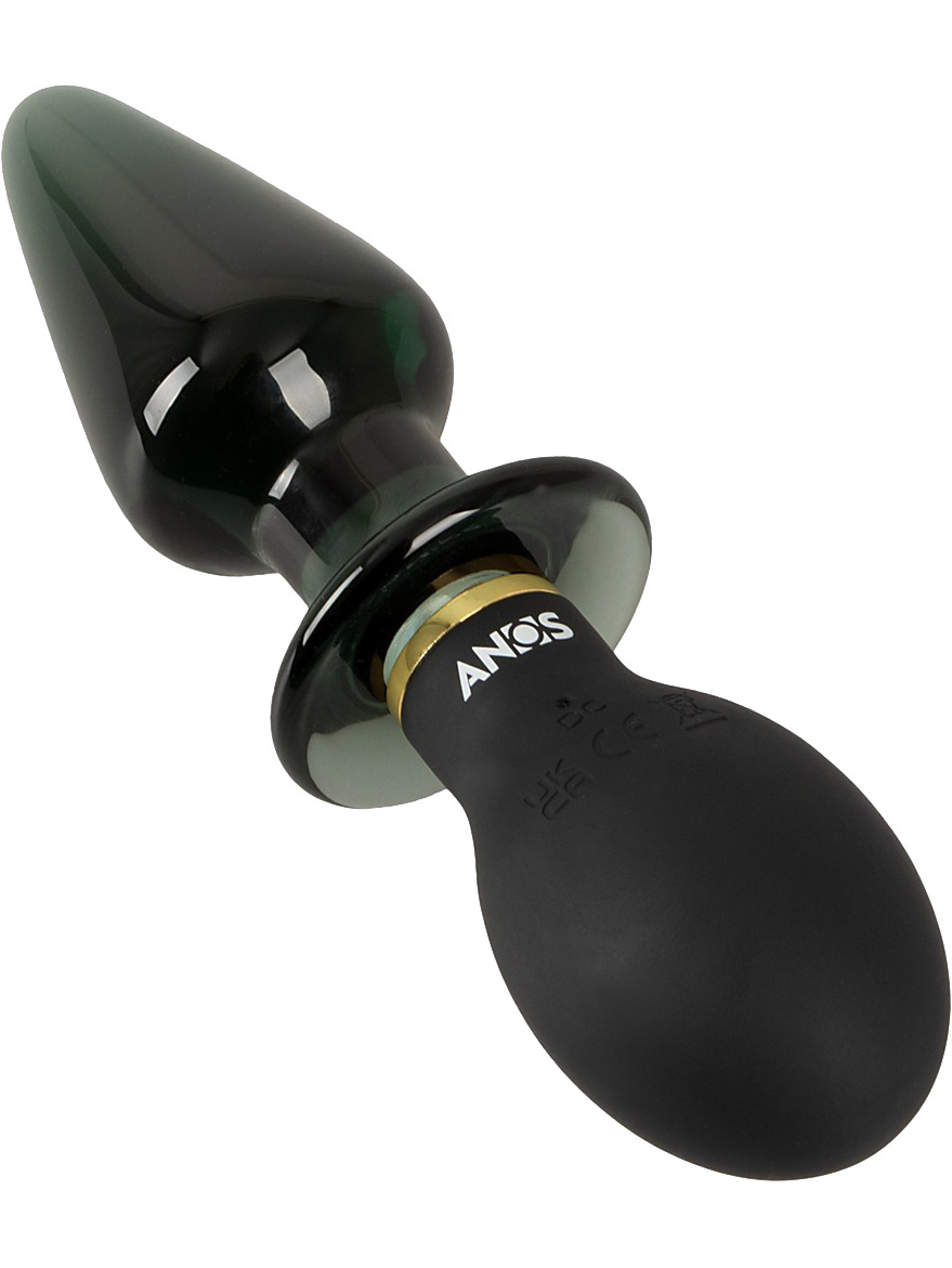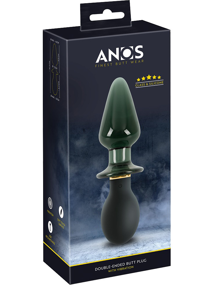 This is a beautifully shaped and vibrating dual-ended butt plug in a high-quality mix of materials so you can enjoy both the feel of silicone and glass. Explore anal stimulation with a rounded silicone plug or be stimulated by the smooth glass plug with subtle LED-lighting at the top. The tapered center has a stop that prevents the plugs from sliding in too far.