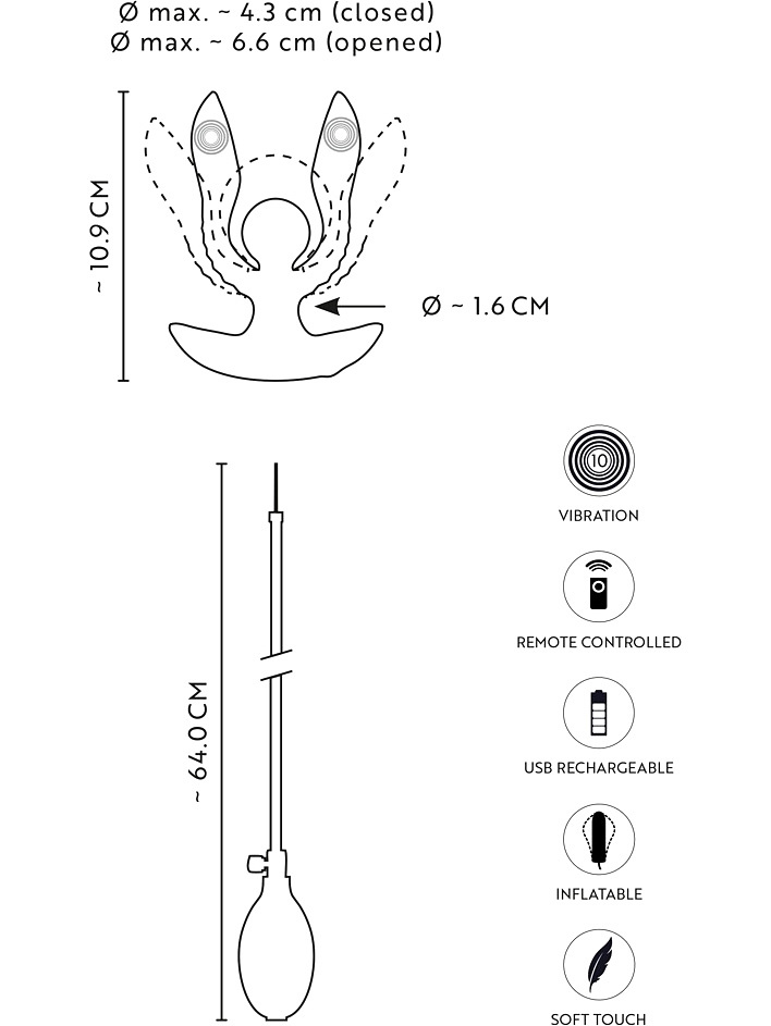 The RC Inflatable Expander Plug from Anos is perfect for those who love the feeling of being filled, stretched and exploring deeper stimulation. The plug is easily inserted when the two arms are held together – and once in place, the inflatable center ball can expand and open up the arms for a powerful, fulfilling sensation in the anal canal.