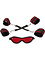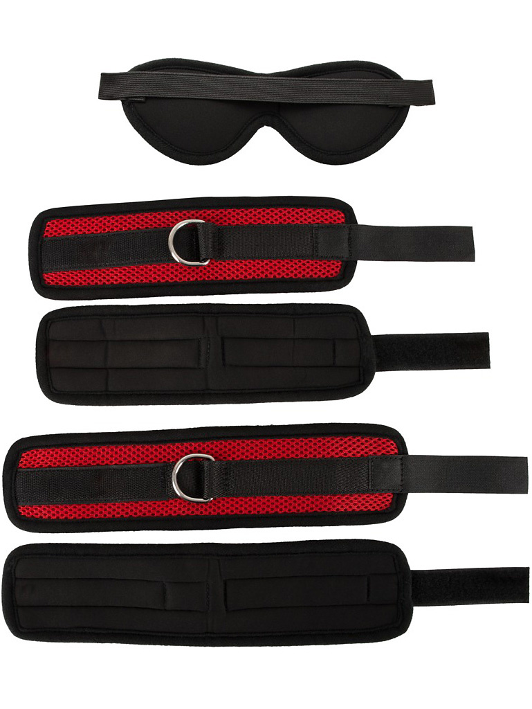 This set includes two handcuffs, two footcuffs and a hog tie for exciting bondage-play. In addition, a matching blindfold is included to enhance the other senses.