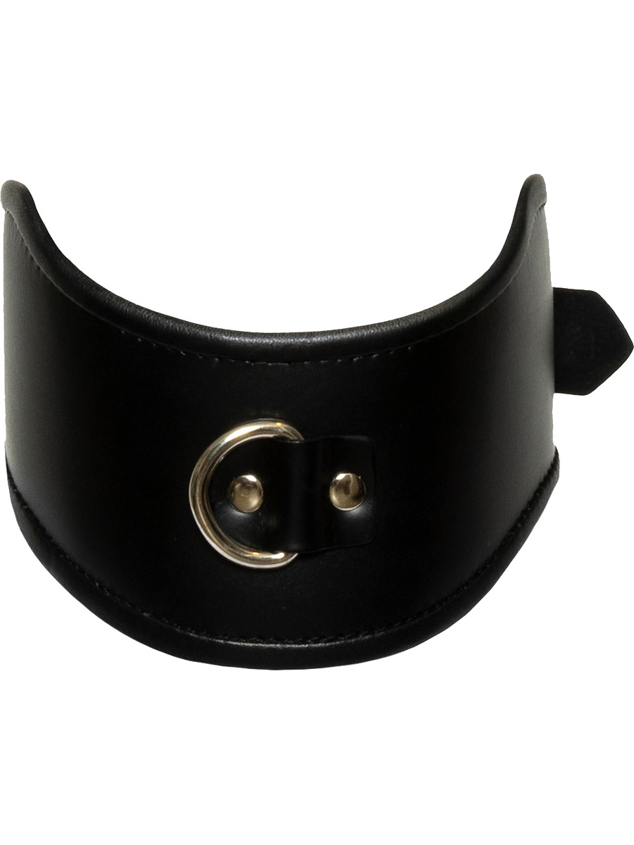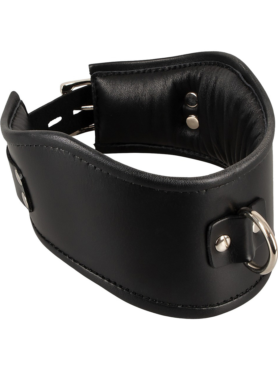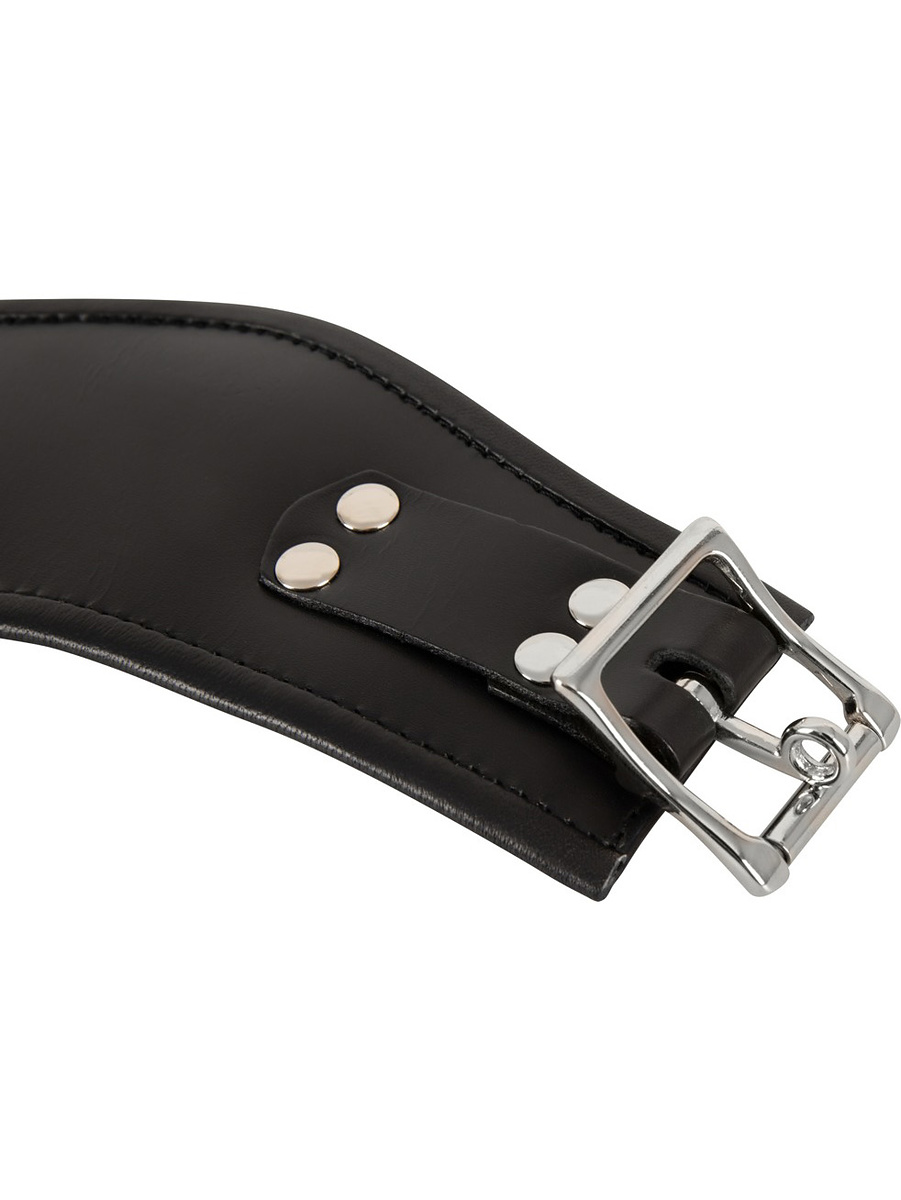 This is a wide and curved necklace from Bad Kitty in a stylish leather-look (polyurethane) with silver metal-details. The collar is comfortably padded and has a sturdy front where you can attach a leash or other accessories.