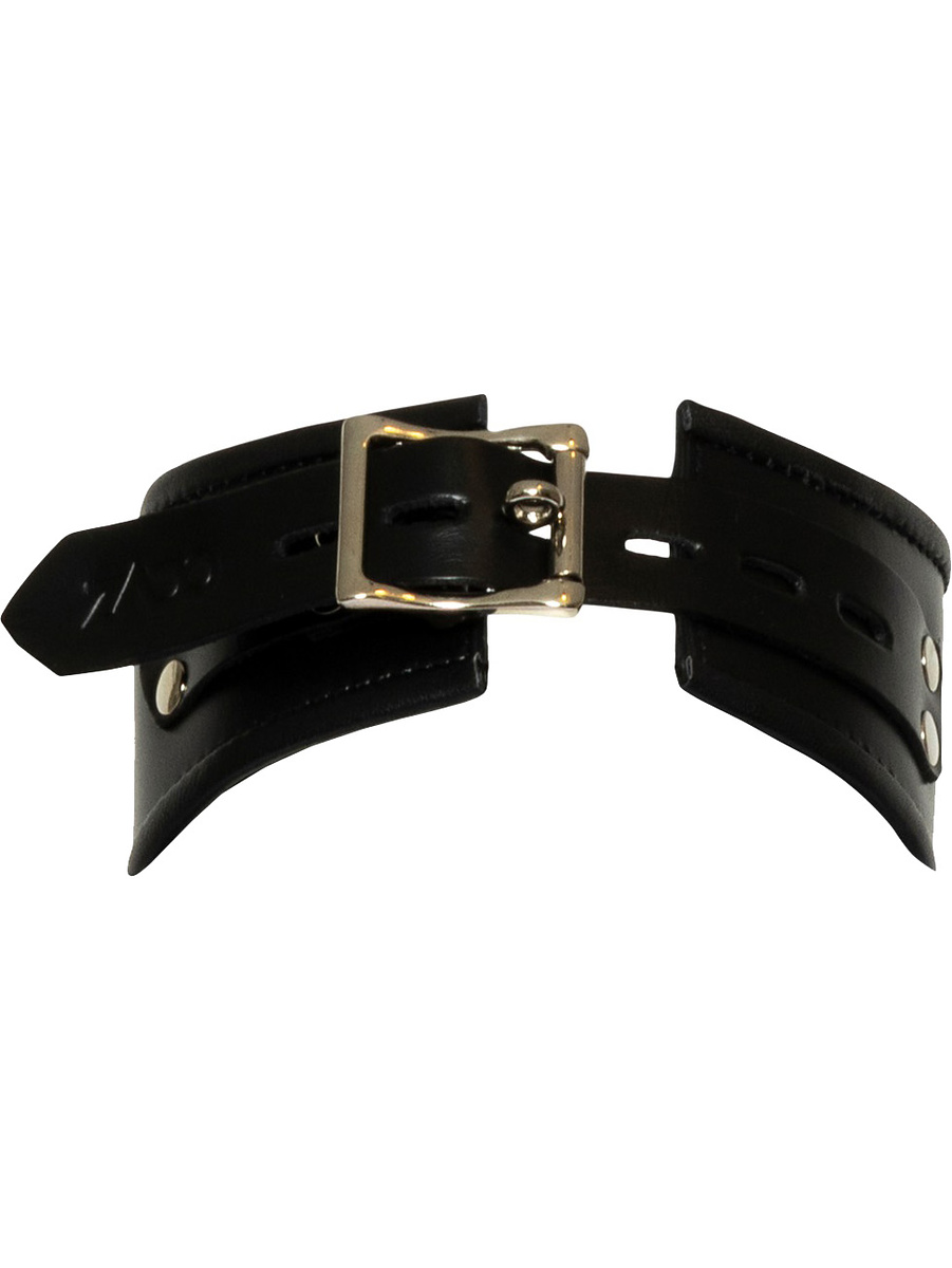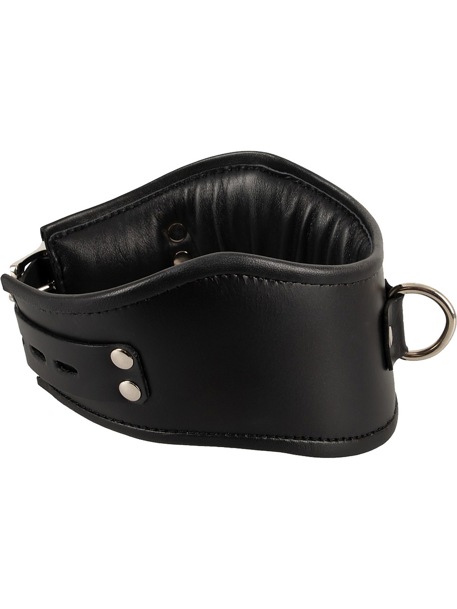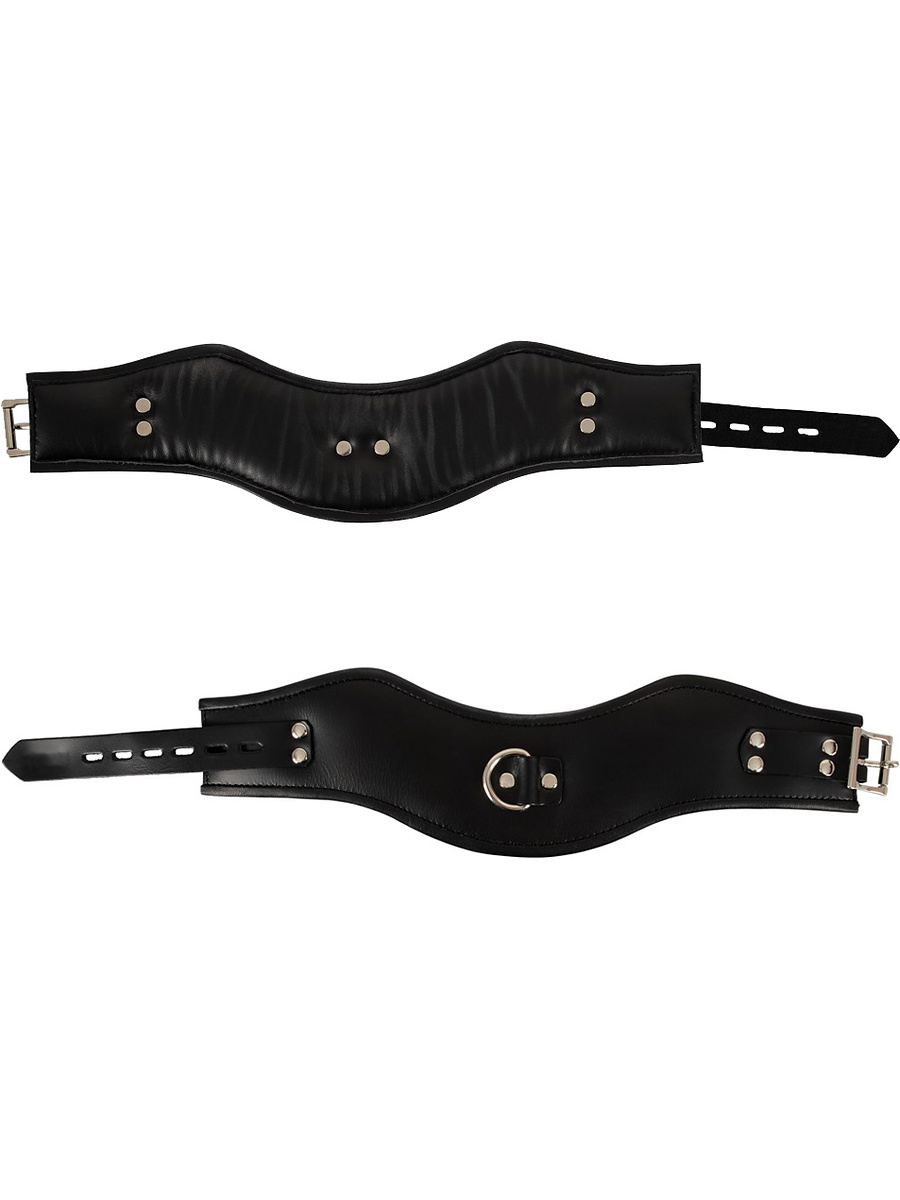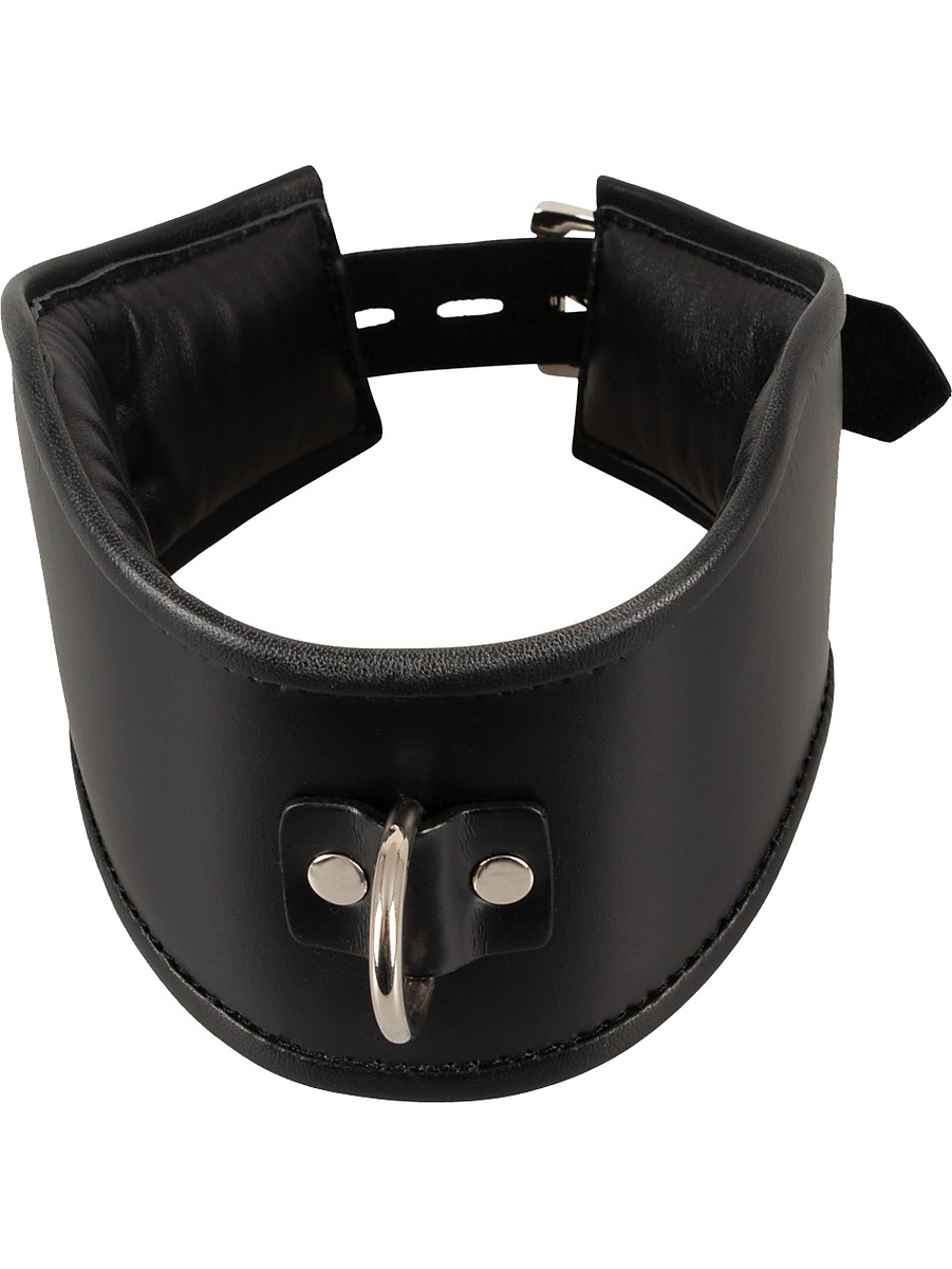 This is a wide and curved necklace from Bad Kitty in a stylish leather-look (polyurethane) with silver metal-details. The collar is comfortably padded and has a sturdy front where you can attach a leash or other accessories.