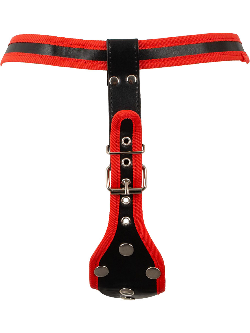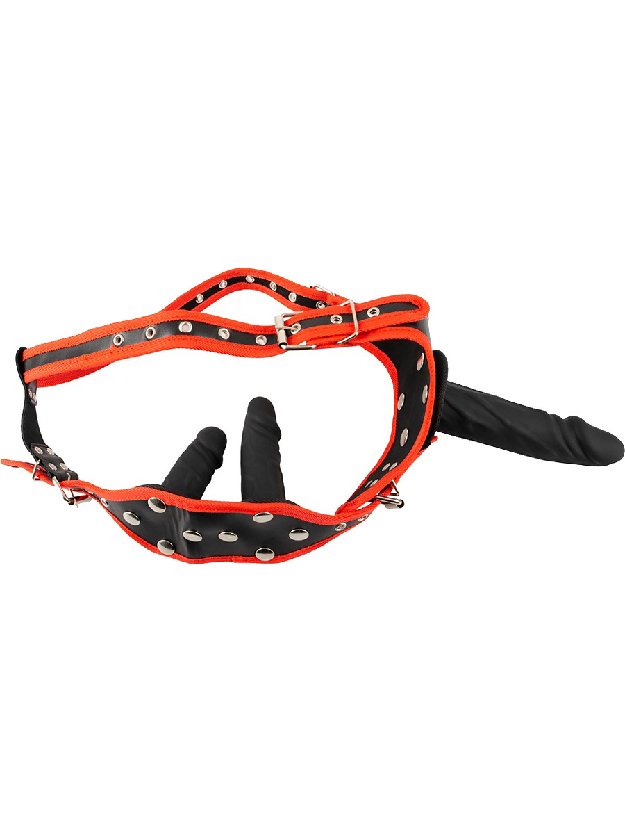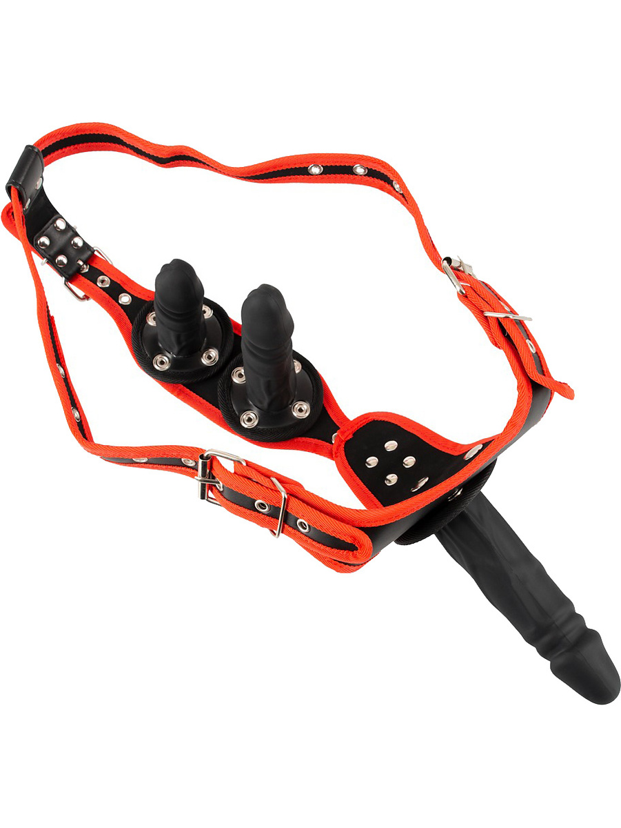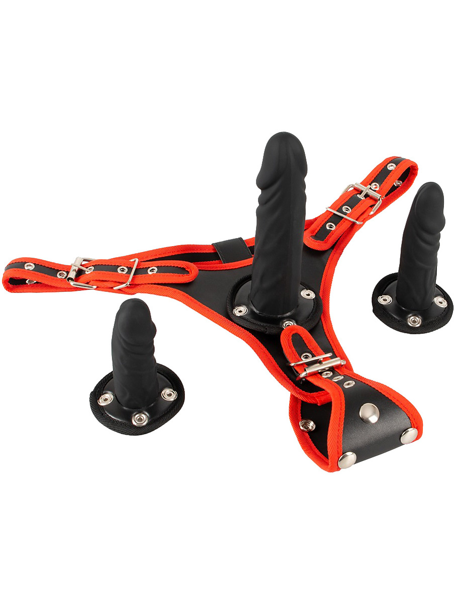 This is a unique harness from Bad Kitty in leather look and red details. The harness comes with three dildos that can be attached to the front and to the inside of the thong. With the dildo at the front, you can penetrate your partner while the two dildos on the inside stimulate you vaginally and anally.
