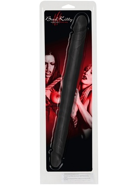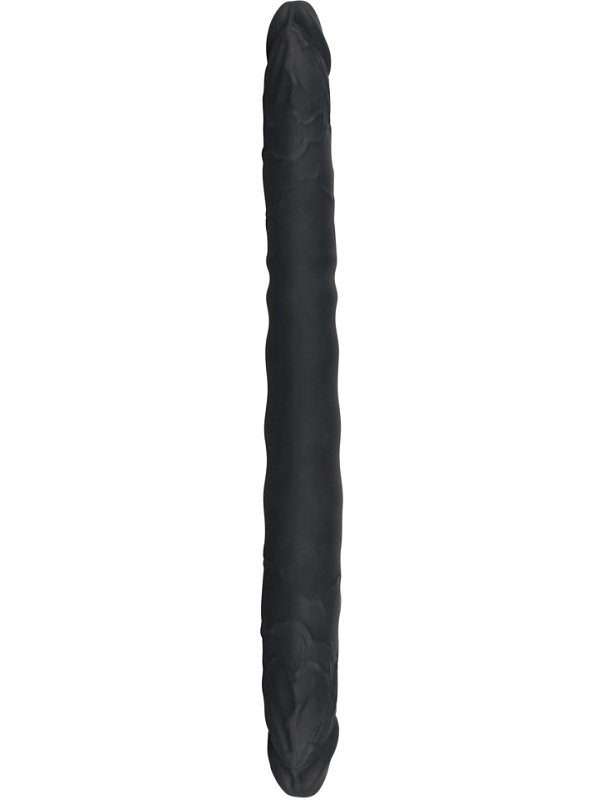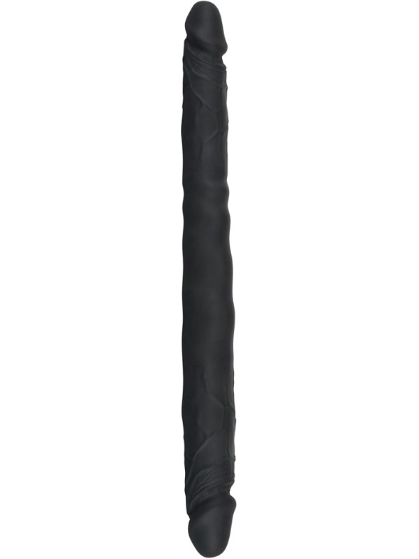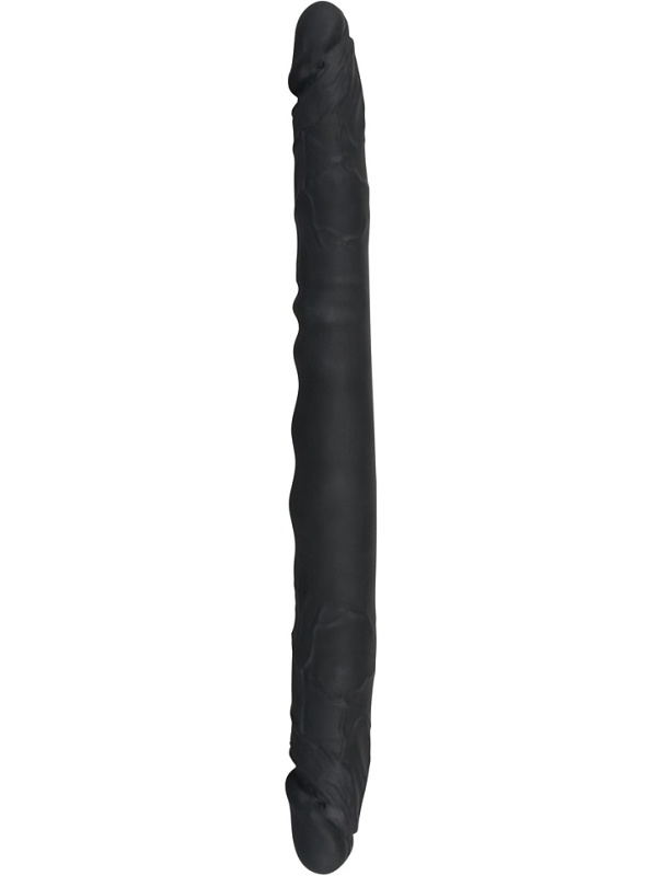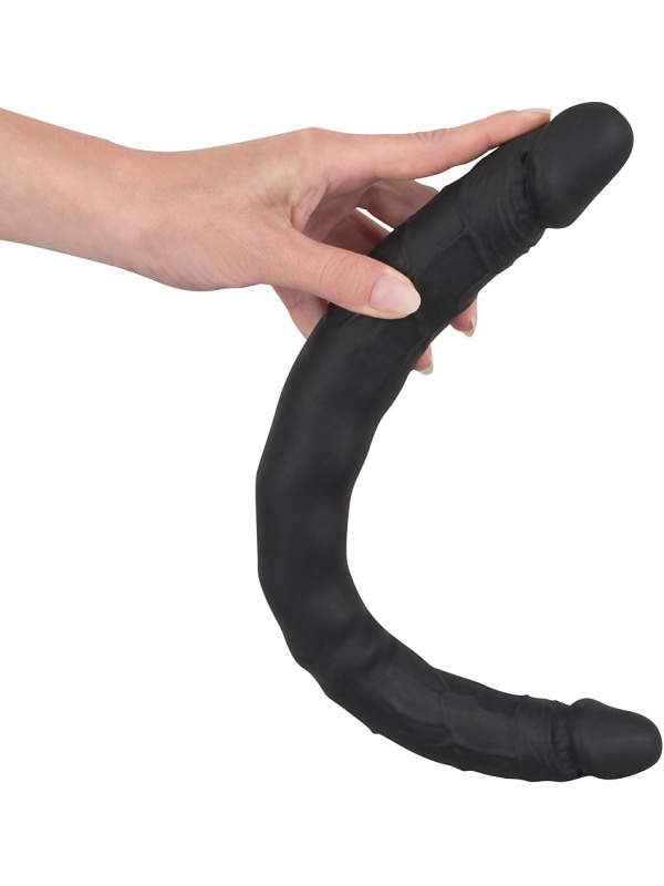 This dildo is made of black silicone and features a realistic design with two well-shaped heads, one on each end. The shaft is gently curved and varies slightly in thickness between the two sides, making it easy to choose what feels best in the moment. Raised veins run along the entire length for added stimulation, while the silky-smooth material feels great against the skin.