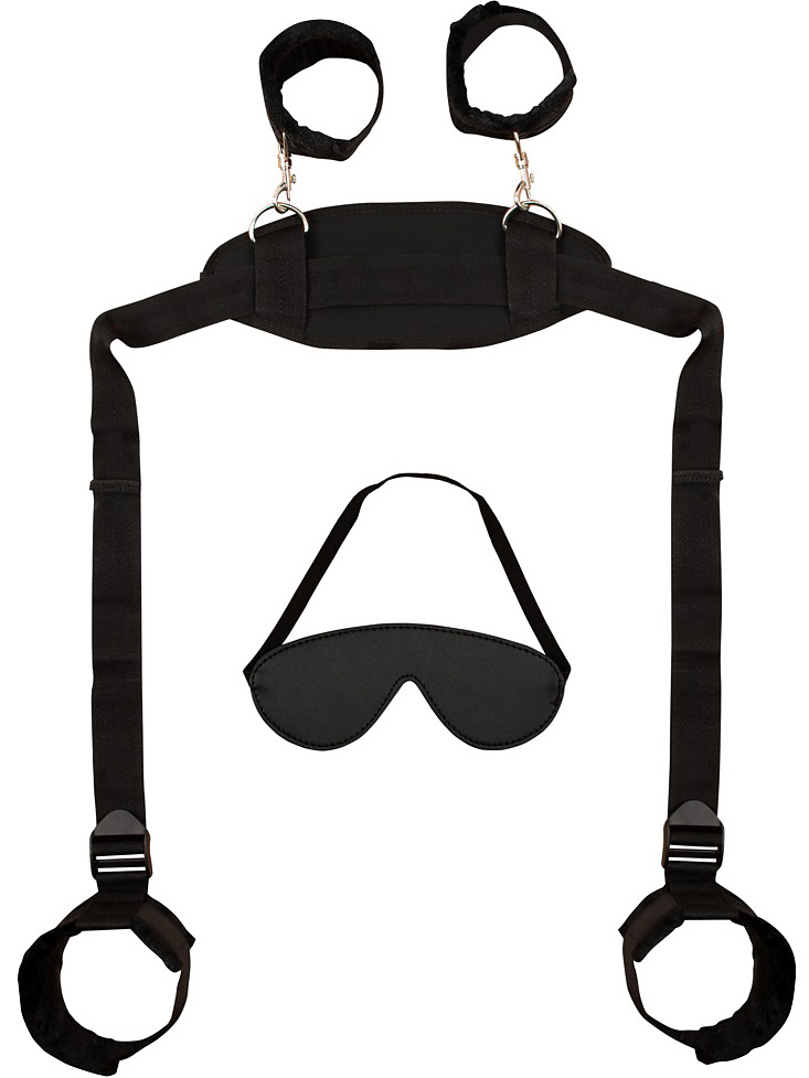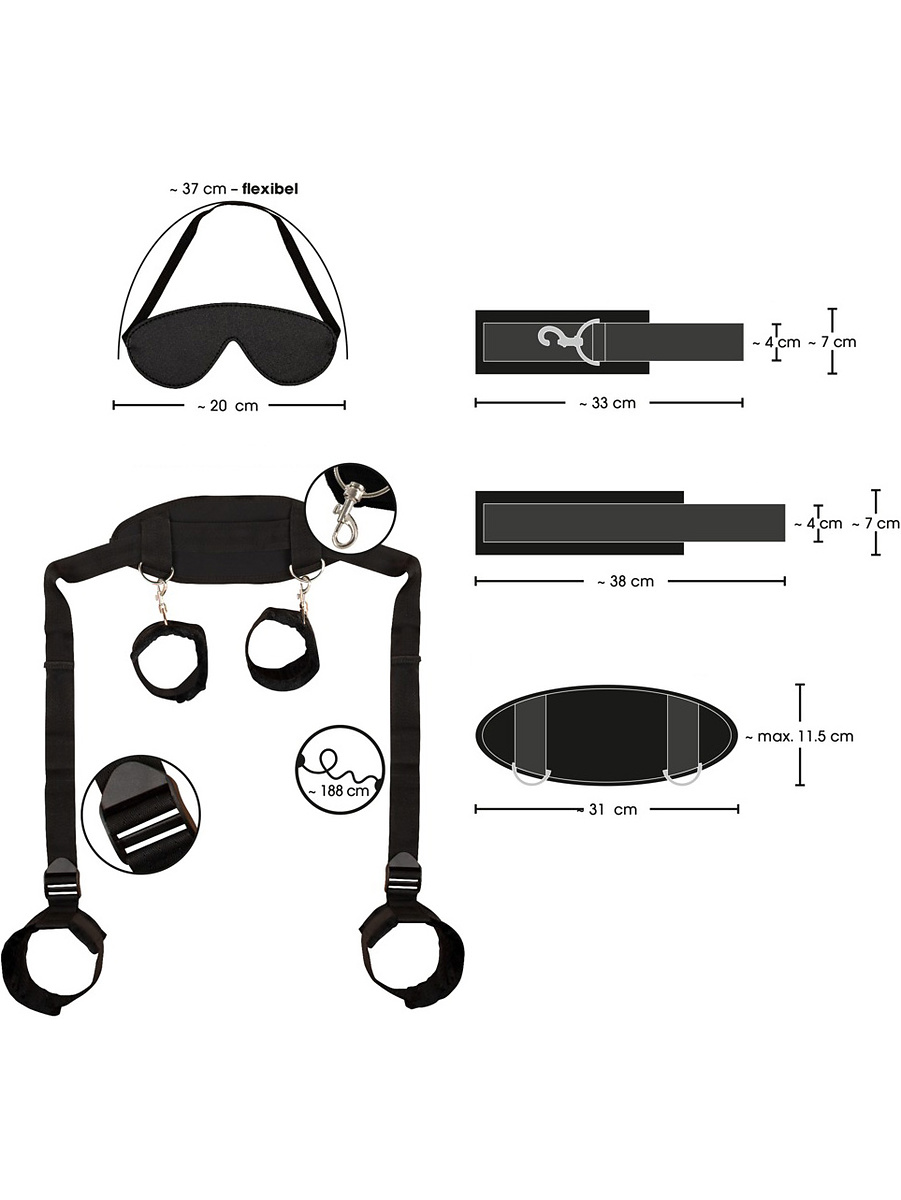 Even the straps leading to the foot shackles can be adjusted. The handcuffs have carabiners and can be removed from the neck guard. For added excitement, a blindfold is included that eliminates the ability to see.