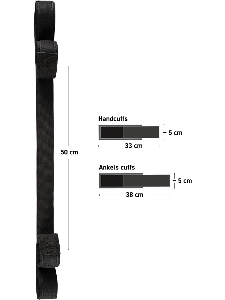 This Spreader Bar from Bad Kitty imprisons the submissive's hands at the ankles. The robust rod is covered in soft fabric and has a 3.5 cm wide metal core. The shackles for wrists and ankles are securely attached to the bar and can be adjusted using velcro.