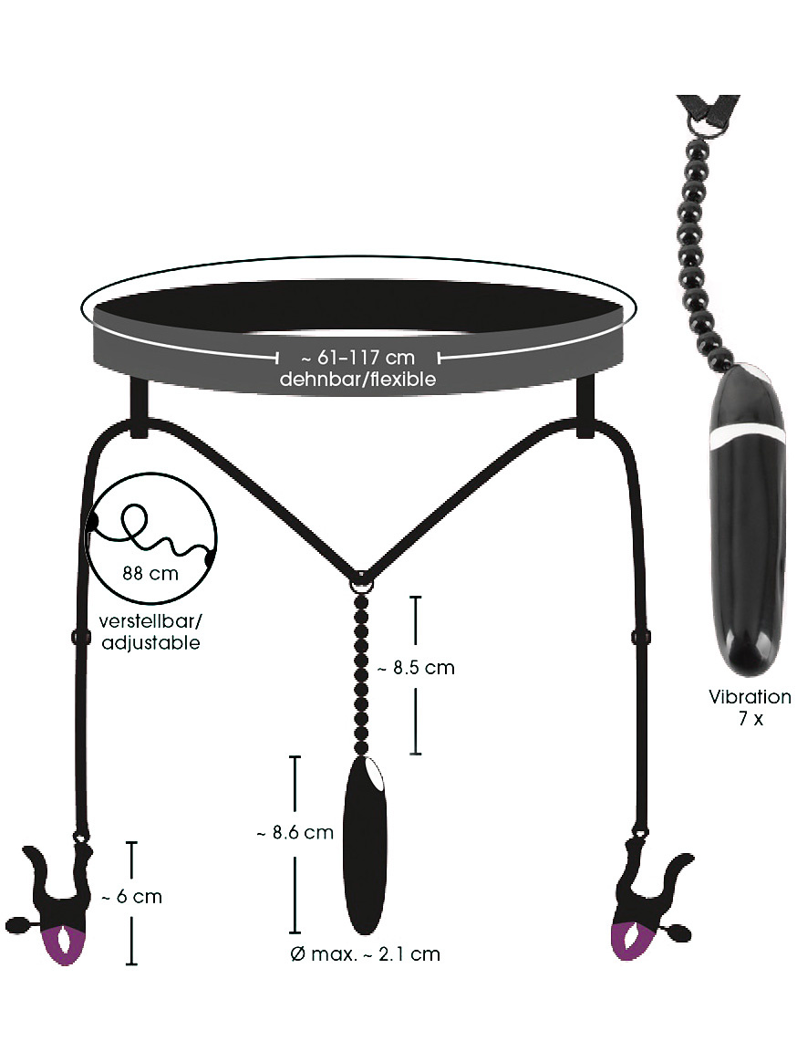 The waistband is flexible and fits waist measurements between 61 - 117 cm. The band where the clips are attached is adjustable and a total of about 88 cm long. The string of pearls has a length of approximately 8.5 cm.