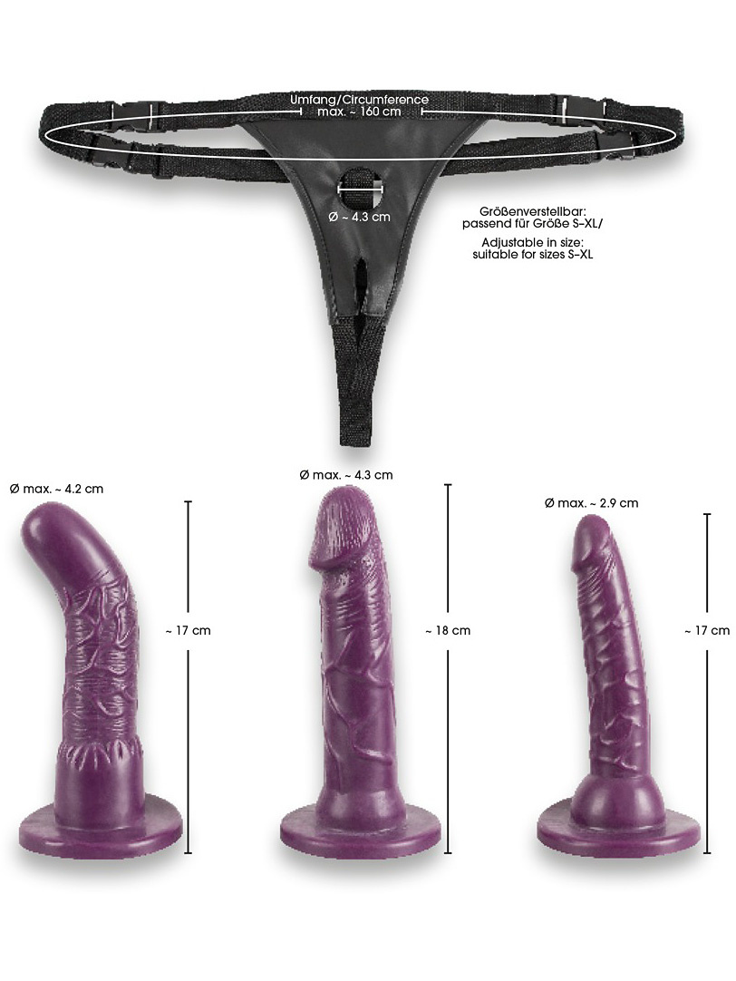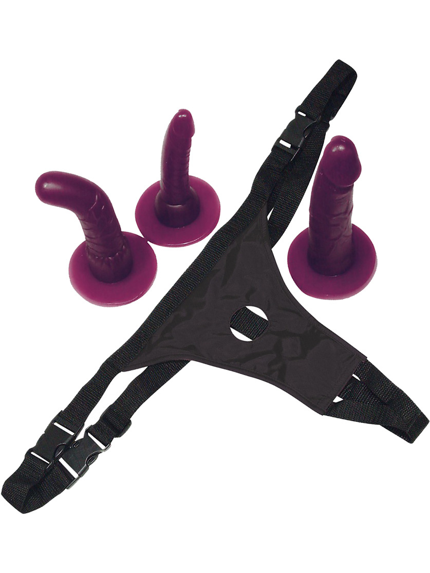 This set includes a crotchless strap-on harness with three different dildos for varied penetration play with your partner.