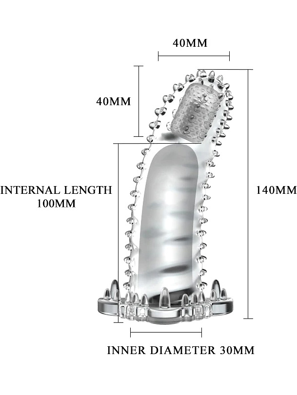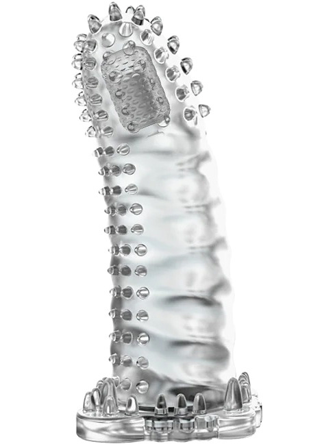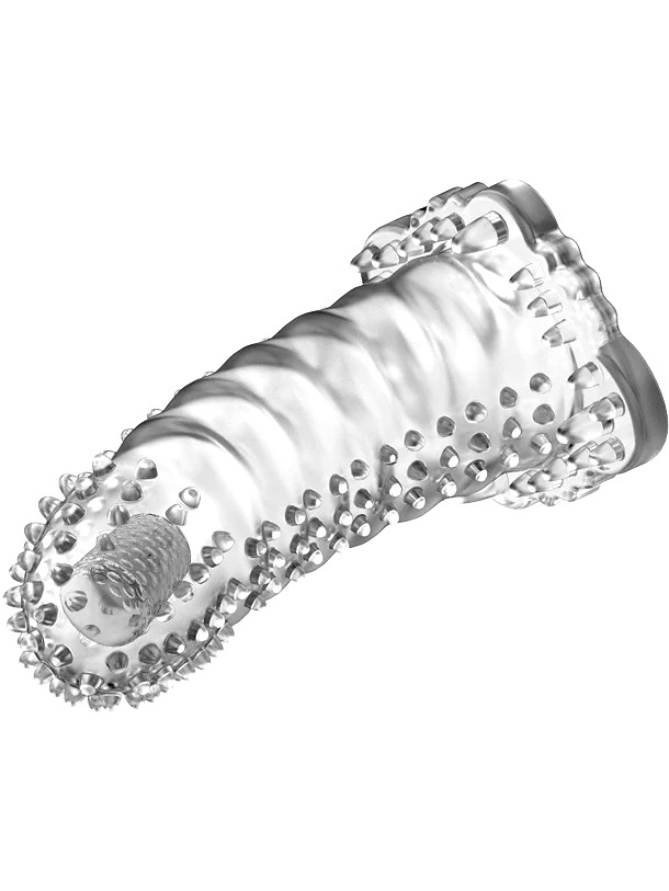 Made from transparent, super-stretchy TPR-material that molds to your body for a snug but comfortable fit, the sleeve increases both length (+ 4cm) and girth, while the knobby surface and vibrating tip send pleasurable impulses with every thrust.